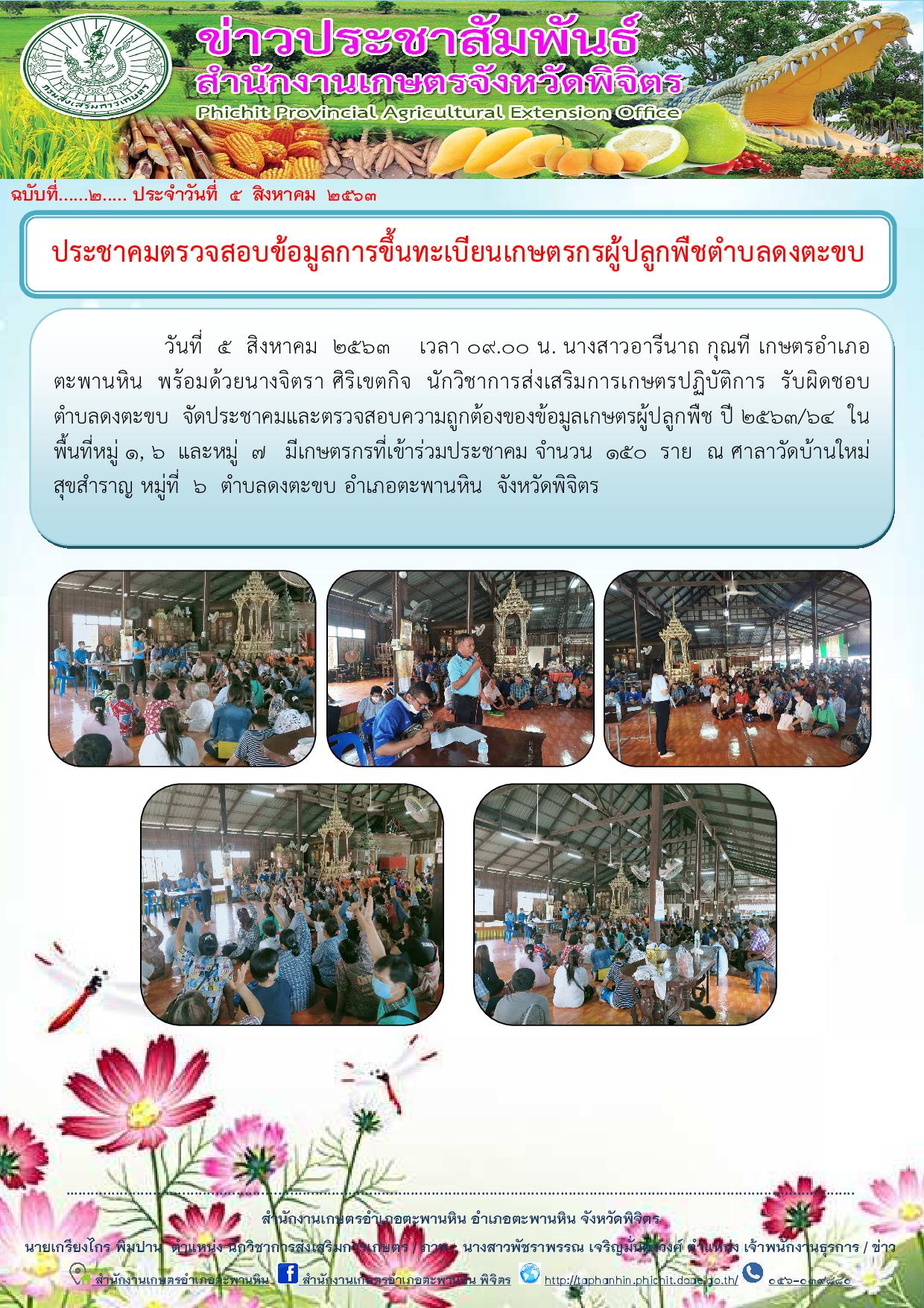 วันที่ 5 สิงหาคม 2563 เวลา 09.00 น. นางสาวอารีนาถ กุณที เกษตรอำเภอตะพานหิน พร้อมด้วยนางจิตรา ศิริเขตกิจ นักวิชาการส่งเสริมการเกษตรปฏิบัติการ รับผิดชอบตำบลดงตะขบ จัดประชาคมและตรวจสอบความถูกต้องของข้อมูลเกษตรผู้ปลูกพืช ปี 2563/64 ในพื้นที่หมู่ 1, 6 และหมู่ 7 มีเกษตรกรที่เข้าร่วมประชาคม จำนวน 150 ราย ณ ศาลาวัดบ้านใหม่สุขสำราญ หมู่ที่ 6 ตำบลดงตะขบ อำเภอตะพานหิน จังหวัดพิจิตร