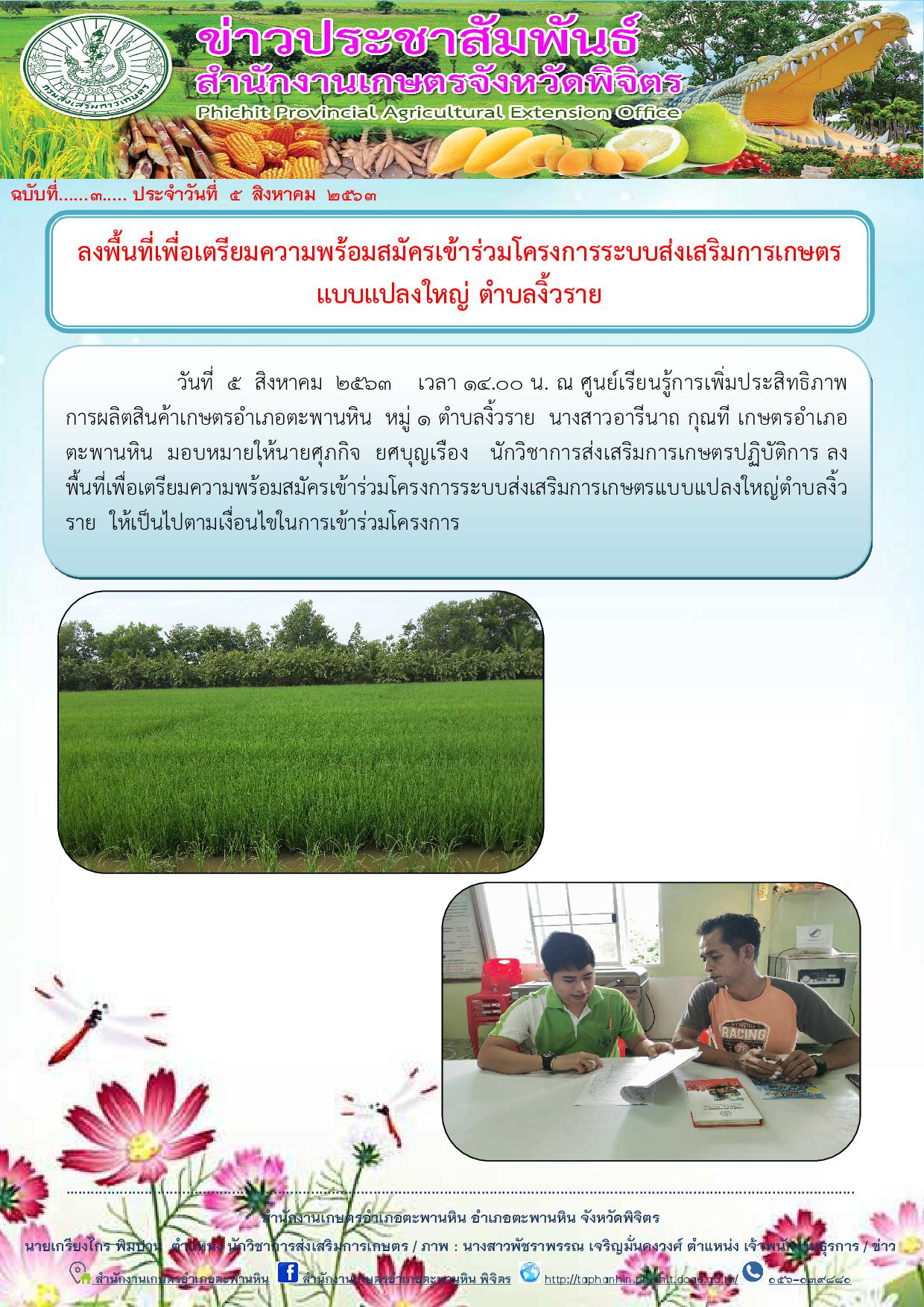 วันที่ 5 สิงหาคม 2563 เวลา 14.00 น. ณ ศูนย์เรียนรู้การเพิ่มประสิทธิภาพการผลิตสินค้าเกษตรอำเภอตะพานหิน หมู่ 1 ตำบลงิ้วราย นางสาวอารีนาถ กุณที เกษตรอำเภอตะพานหิน มอบหมายให้นายศุภกิจ ยศบุญเรือง นักวิชาการส่งเสริมการเกษตรปฏิบัติการ ลงพื้นที่เพื่อเตรียมความพร้อมสมัครเข้าร่วมโครงการระบบส่งเสริมการเกษตรแบบแปลงใหญ่ตำบลงิ้วราย ให้เป็นไปตามเงื่อนไขในการเข้าร่วมโครงการ