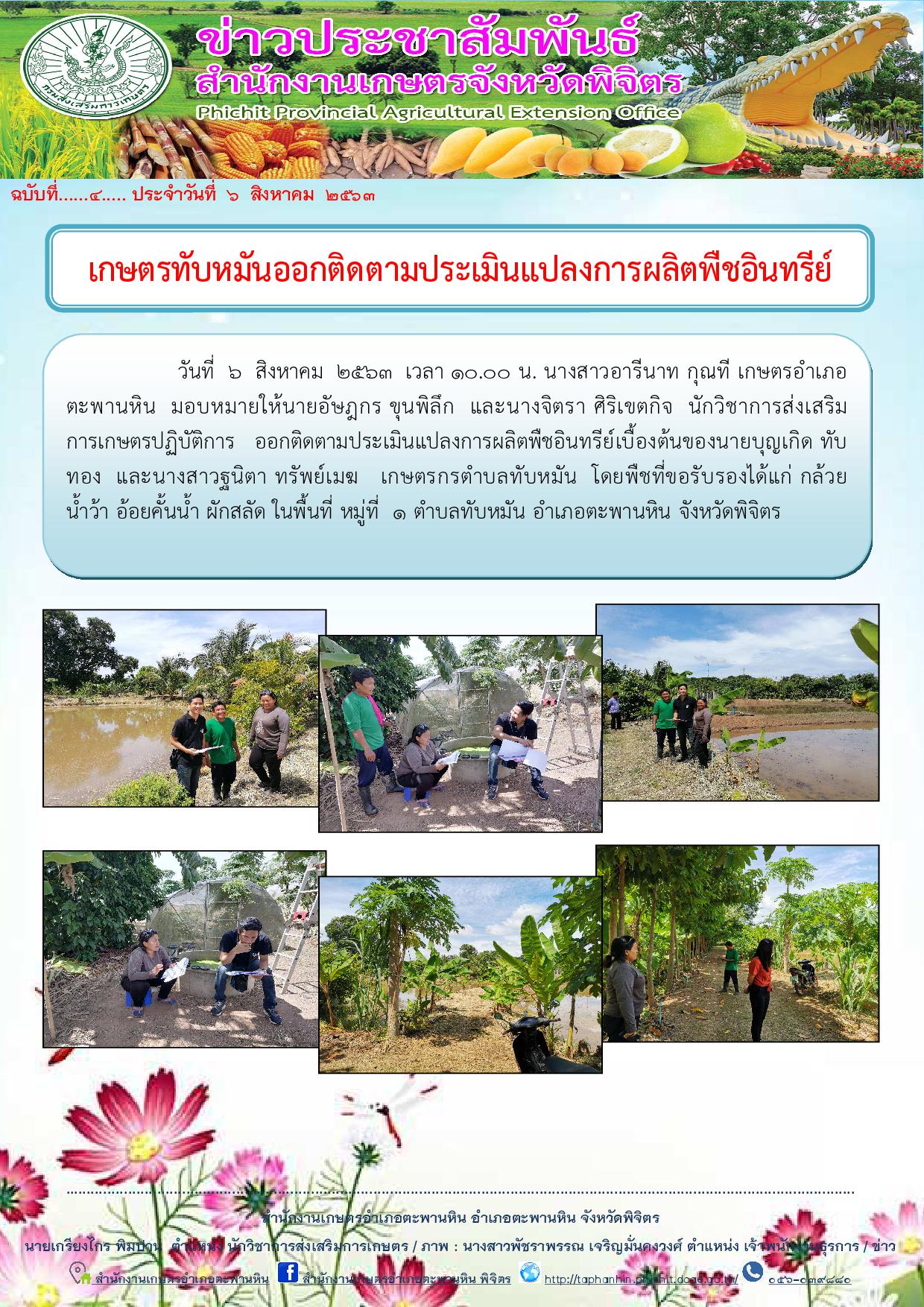 วันที่ 6 สิงหาคม 2563 เวลา 10.00 น. นางสาวอารีนาท กุณที เกษตรอำเภอตะพานหิน มอบหมายให้นายอัษฎกร ขุนพิลึก และนางจิตรา ศิริเขตกิจ นักวิชาการส่งเสริมการเกษตรปฏิบัติการ ออกติดตามประเมินแปลงการผลิตพืชอินทรีย์เบื้องต้นของนายบุญเกิด ทับทอง และนางสาวฐนิตา ทรัพย์เมฆ เกษตรกรตำบลทับหมัน โดยพืชที่ขอรับรองได้แก่ กล้วยน้ำว้า อ้อยคั้นน้ำ ผักสลัด ในพื้นที่ หมู่ที่ 1 ตำบลทับหมัน อำเภอตะพานหิน จังหวัดพิจิตร