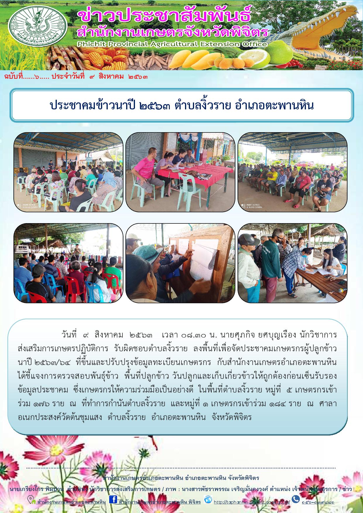 วันที่ 9 สิงหาคม 2563 เวลา 08.30 น. นายศุภกิจ ยศบุญเรือง นักวิชาการส่งเสริมการเกษตรปฏิบัติการ รับผิดชอบตำบลงิ้วราย ลงพื้นที่เพื่อจัดประชาคมเกษตรกรผู้ปลูกข้าวนาปี 2563/64 ที่ขึ้นและปรับปรุงข้อมูลทะเบียนเกษตรกร กับสำนักงานเกษตรอำเภอตะพานหิน ได้ชี้แจงการตรวจสอบพันธุ์ข้าว พื้นที่ปลูกข้าว วันปลูกและเก็บเกี่ยวข้าวให้ถูกต้องก่อนเซ็นรับรองข้อมูลประชาคม ซึ่งเกษตรกรให้ความร่วมมือเป็นอย่างดี ในพื้นที่ตำบลงิ้วราย หมู่ที่ 5 เกษตรกรเข้าร่วม 176 ราย ณ ที่ทำการกำนันตำบลงิ้วราย และหมู่ที่ 1 เกษตรกรเข้าร่วม 184 ราย ณ ศาลาอเนกประสงค์วัดต้นชุมแสง ตำบลงิ้วราย อำเภอตะพานหิน จังหวัดพิจิตร