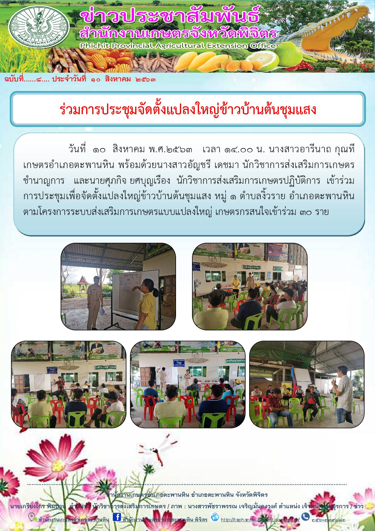 วันที่ 10 สิงหาคม พ.ศ.2563 เวลา 14.00 น. นางสาวอารีนาถ กุณที เกษตรอำเภอตะพานหิน พร้อมด้วยนางสาวอัญชรี เดชมา นักวิชาการส่งเสริมการเกษตรชำนาญการ และนายศุภกิจ ยศบุญเรือง นักวิชาการส่งเสริมการเกษตรปฏิบัติการ เข้าร่วมการประชุมเพื่อจัดตั้งแปลงใหญ่ข้าวบ้านต้นชุมแสง หมู่ 1 ตำบลงิ้วราย อำเภอตะพานหิน ตามโครงการระบบส่งเสริมการเกษตรแบบแปลงใหญ่ เกษตรกรสนใจเข้าร่วม 30 ราย