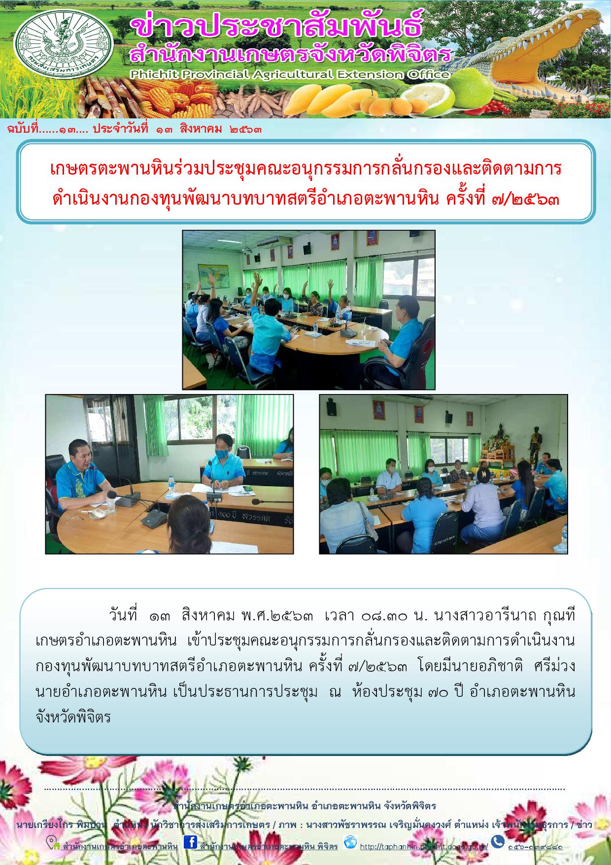 วันที่ 13 สิงหาคม พ.ศ.2563 เวลา 08.30 น. นางสาวอารีนาถ กุณที เกษตรอำเภอตะพานหิน เข้าประชุมคณะอนุกรรมการกลั่นกรองและติดตามการดำเนินงานกองทุนพัฒนาบทบาทสตรีอำเภอตะพานหิน ครั้งที่ 7/2563 โดยมีนายอภิชาติ ศรีม่วง นายอำเภอตะพานหิน เป็นประธานการประชุม ณ ห้องประชุม 70 ปี อำเภอตะพานหิน จังหวัดพิจิตร
