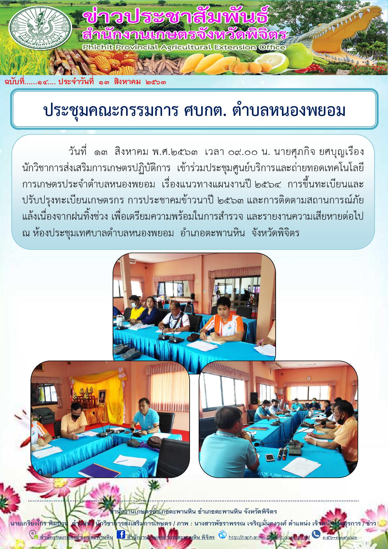 วันที่ 13 สิงหาคม พ.ศ.2563 เวลา 09.00 น. นายศุภกิจ ยศบุญเรือง นักวิชาการส่งเสริมการเกษตรปฏิบัติการ เข้าร่วมประชุมศูนย์บริการและถ่ายทอดเทคโนโลยีการเกษตรประจำตำบลหนองพยอม เรื่องแนวทางแผนงานปี 2564 การขึ้นทะเบียนและปรับปรุงทะเบียนเกษตรกร การประชาคมข้าวนาปี 2563 และการติดตามสถานการณ์ภัยแล้งเนื่องจากฝนทิ้งช่วง เพื่อเตรียมความพร้อมในการสำรวจ และรายงานความเสียหายต่อไป ณ ห้องประชุมเทศบาลตำบลหนองพยอม อำเภอตะพานหิน จังหวัดพิจิตร