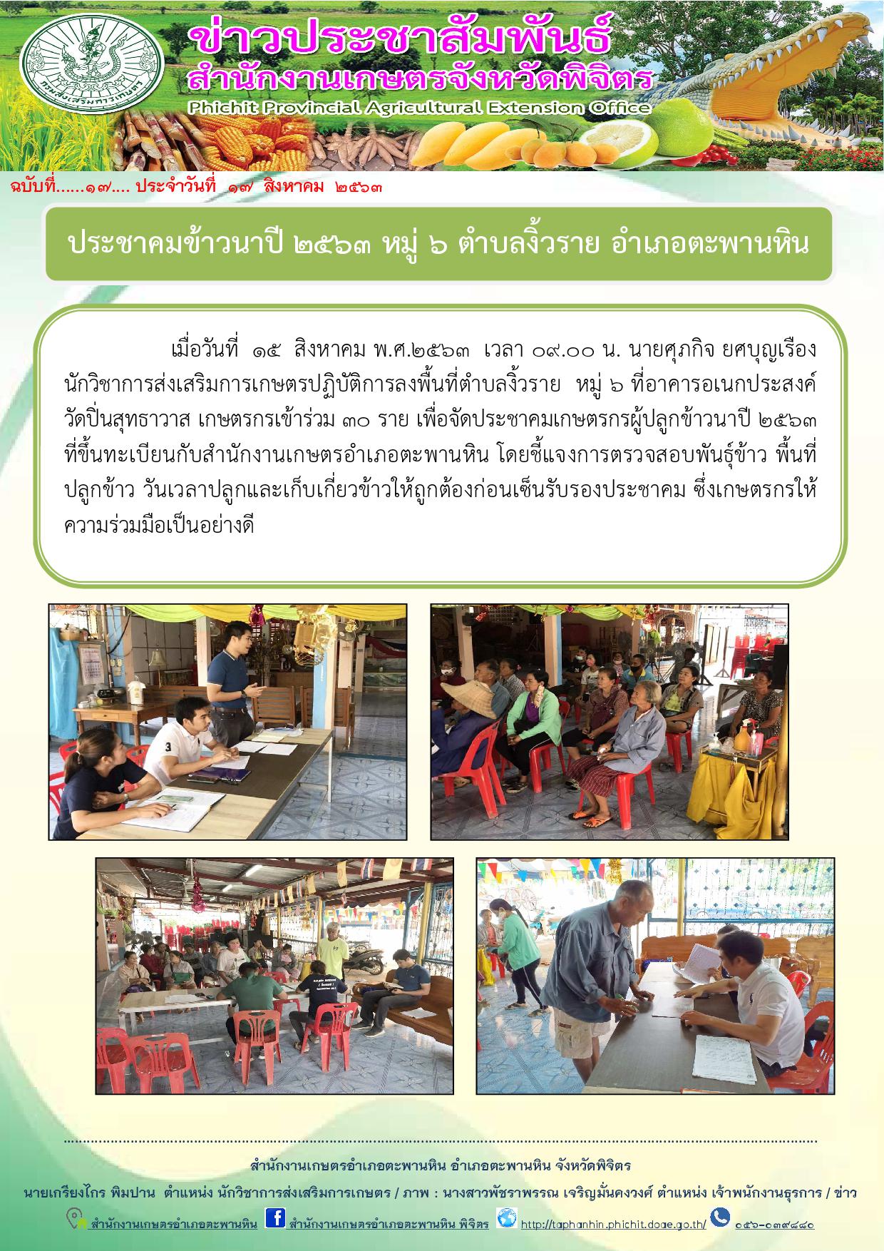 เมื่อวันที่ 15 สิงหาคม พ.ศ.2563 เวลา 09.00 น. นายศุภกิจ ยศบุญเรือง นักวิชาการส่งเสริมการเกษตรปฏิบัติการลงพื้นที่ตำบลงิ้วราย หมู่ 6 ที่อาคารอเนกประสงค์ วัดปิ่นสุทธาวาส เกษตรกรเข้าร่วม 30 ราย เพื่อจัดประชาคมเกษตรกรผู้ปลูกข้าวนาปี 2563 ที่ขึ้นทะเบียนกับสำนักงานเกษตรอำเภอตะพานหิน โดยชี้แจงการตรวจสอบพันธุ์ข้าว พื้นที่ปลูกข้าว วันเวลาปลูกและเก็บเกี่ยวข้าวให้ถูกต้องก่อนเซ็นรับรองประชาคม ซึ่งเกษตรกรให้ความร่วมมือเป็นอย่างดี