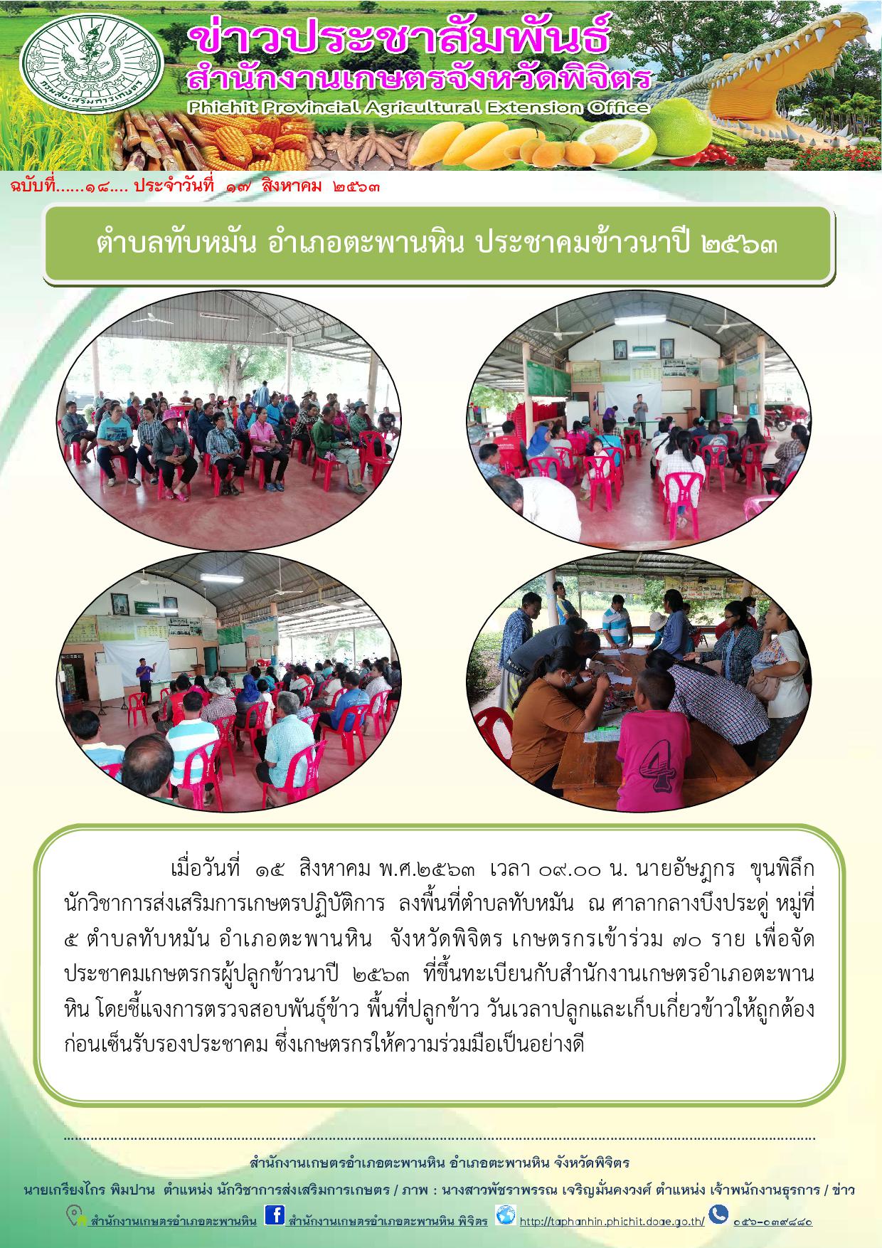 เมื่อวันที่ 15 สิงหาคม พ.ศ.2563 เวลา 09.00 น. นายอัษฎกร ขุนพิลึก นักวิชาการส่งเสริมการเกษตรปฏิบัติการ ลงพื้นที่ตำบลทับหมัน ณ ศาลากลางบึงประดู่ หมู่ที่ 5 ตำบลทับหมัน อำเภอตะพานหิน จังหวัดพิจิตร เกษตรกรเข้าร่วม 70 ราย เพื่อจัดประชาคมเกษตรกรผู้ปลูกข้าวนาปี 2563 ที่ขึ้นทะเบียนกับสำนักงานเกษตรอำเภอตะพานหิน โดยชี้แจงการตรวจสอบพันธุ์ข้าว พื้นที่ปลูกข้าว วันเวลาปลูกและเก็บเกี่ยวข้าวให้ถูกต้องก่อนเซ็นรับรองประชาคม ซึ่งเกษตรกรให้ความร่วมมือเป็นอย่างดี