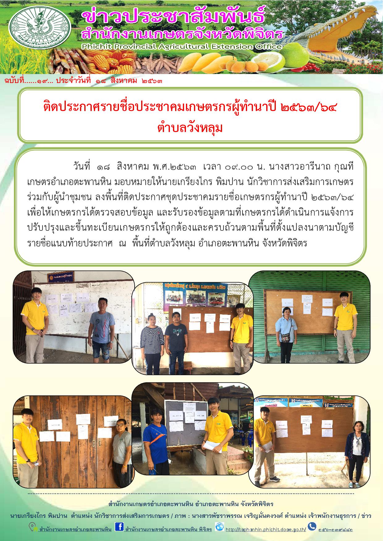 วันที่ 18 สิงหาคม พ.ศ.2563 เวลา 09.00 น. นางสาวอารีนาถ กุณที เกษตรอำเภอตะพานหิน มอบหมายให้นายเกรียงไกร พิมปาน นักวิชาการส่งเสริมการเกษตร ร่วมกับผู้นำชุมชน ลงพื้นที่ติดประกาศชุดประชาคมรายชื่อเกษตรกรผู้ทำนาปี 2563/64 เพื่อให้เกษตรกรได้ตรวจสอบข้อมูล และรับรองข้อมูลตามที่เกษตรกรได้ดำเนินการแจ้งการปรับปรุงและขึ้นทะเบียนเกษตรกรให้ถูกต้องและครบถ้วนตามพื้นที่ตั้งแปลงนาตามบัญชีรายชื่อแนบท้ายประกาศ ณ พื้นที่ตำบลวังหลุม อำเภอตะพานหิน จังหวัดพิจิตร
