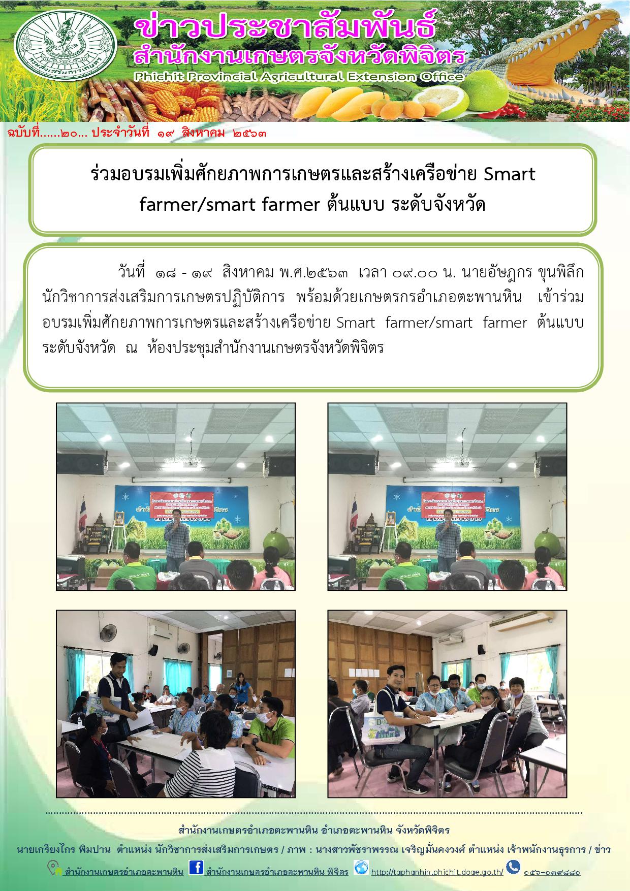 วันที่ 18 – 19 สิงหาคม พ.ศ.2563 เวลา 09.00 น. นายอัษฎกร ขุนพิลึก นักวิชาการส่งเสริมการเกษตรปฏิบัติการ พร้อมด้วยเกษตรกรอำเภอตะพานหิน เข้าร่วมอบรมเพิ่มศักยภาพการเกษตรและสร้างเครือข่าย Smart farmer/smart farmer ต้นแบบ ระดับจังหวัด ณ ห้องประชุมสำนักงานเกษตรจังหวัดพิจิตร