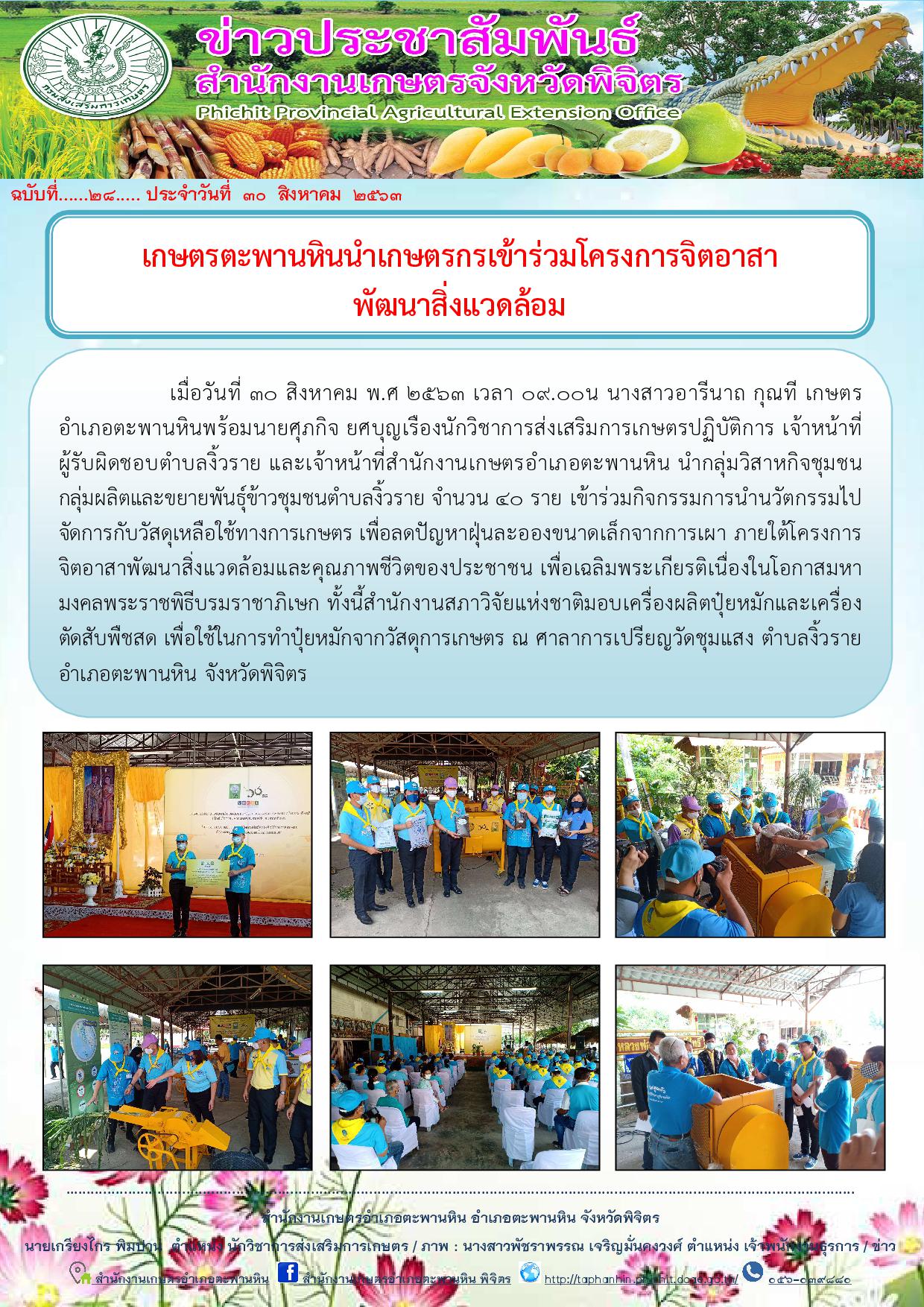 เมื่อวันที่ 30 สิงหาคม พ.ศ 2563 เวลา 09.00น นางสาวอารีนาถ กุณที เกษตรอำเภอตะพานหินพร้อมนายศุภกิจ ยศบุญเรืองนักวิชาการส่งเสริมการเกษตรปฏิบัติการ เจ้าหน้าที่ผู้รับผิดชอบตำบลงิ้วราย และเจ้าหน้าที่สำนักงานเกษตรอำเภอตะพานหิน นำกลุ่มวิสาหกิจชุมชนกลุ่มผลิตและขยายพันธุ์ข้าวชุมชนตำบลงิ้วราย จำนวน 40 ราย เข้าร่วมกิจกรรมการนำนวัตกรรมไปจัดการกับวัสดุเหลือใช้ทางการเกษตร เพื่อลดปัญหาฝุ่นละอองขนาดเล็กจากการเผา ภายใต้โครงการจิตอาสาพัฒนาสิ่งแวดล้อมและคุณภาพชีวิตของประชาชน เพื่อเฉลิมพระเกียรติเนื่องในโอกาสมหามงคลพระราชพิธีบรมราชาภิเษก ทั้งนี้สำนักงานสภาวิจัยแห่งชาติมอบเครื่องผลิตปุ๋ยหมักและเครื่องตัดสับพืชสด เพื่อใช้ในการทำปุ๋ยหมักจากวัสดุการเกษตร ณ ศาลาการเปรียญวัดชุมแสง ตำบลงิ้วราย อำเภอตะพานหิน จังหวัดพิจิตร