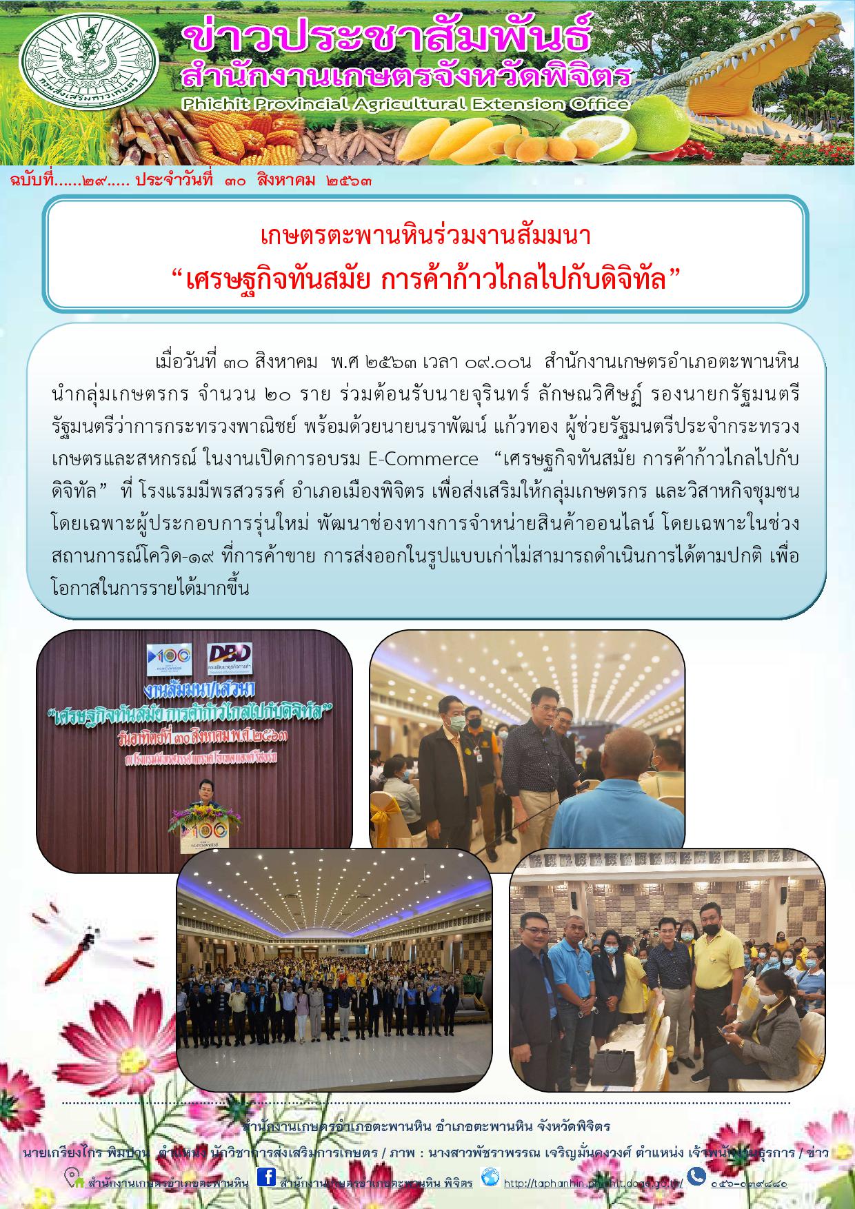เมื่อวันที่ 30 สิงหาคม พ.ศ 2563 เวลา 09.00น สำนักงานเกษตรอำเภอตะพานหิน นำกลุ่มเกษตรกร จำนวน 20 ราย ร่วมต้อนรับนายจุรินทร์ ลักษณวิศิษฏ์ รองนายกรัฐมนตรี รัฐมนตรีว่าการกระทรวงพาณิชย์ พร้อมด้วยนายนราพัฒน์ แก้วทอง ผู้ช่วยรัฐมนตรีประจำกระทรวงเกษตรและสหกรณ์ ในงานเปิดการอบรม E-Commerce “เศรษฐกิจทันสมัย การค้าก้าวไกลไปกับดิจิทัล” ที่ โรงแรมมีพรสวรรค์ อำเภอเมืองพิจิตร เพื่อส่งเสริมให้กลุ่มเกษตรกร และวิสาหกิจชุมชน โดยเฉพาะผู้ประกอบการรุ่นใหม่ พัฒนาช่องทางการจำหน่ายสินค้าออนไลน์ โดยเฉพาะในช่วงสถานการณ์โควิด-19 ที่การค้าขาย การส่งออกในรูปแบบเก่าไม่สามารถดำเนินการได้ตามปกติ เพื่อโอกาสในการรายได้มากขึ้น
