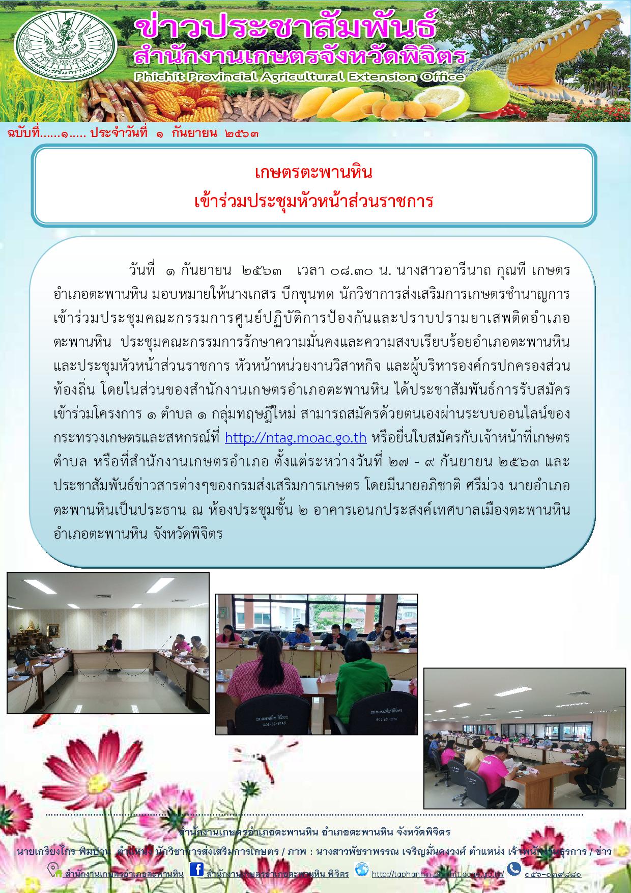 วันที่ 1 กันยายน ๒๕๖3 เวลา ๐8.3๐ น. นางสาวอารีนาถ กุณที เกษตรอำเภอตะพานหิน มอบหมายให้นางเกสร บีกขุนทด นักวิชาการส่งเสริมการเกษตรชำนาญการ เข้าร่วมประชุมคณะกรรมการศูนย์ปฏิบัติการป้องกันและปราบปรามยาเสพติดอำเภอ ตะพานหิน ประชุมคณะกรรมการรักษาความมั่นคงและความสงบเรียบร้อยอำเภอตะพานหิน และประชุมหัวหน้าส่วนราชการ หัวหน้าหน่วยงานวิสาหกิจ และผู้บริหารองค์กรปกครองส่วนท้องถิ่น โดยในส่วนของสำนักงานเกษตรอำเภอตะพานหิน ได้ประชาสัมพันธ์การรับสมัคร เข้าร่วมโครงการ 1 ตำบล 1 กลุ่มทฤษฎีใหม่ สามารถสมัครด้วยตนเองผ่านระบบออนไลน์ของกระทรวงเกษตรและสหกรณ์ที่ http://ntag.moac.go.th หรือยื่นใบสมัครกับเจ้าหน้าที่เกษตรตำบล หรือที่สำนักงานเกษตรอำเภอ ตั้งแต่ระหว่างวันที่ 27 – 9 กันยายน 2563 และประชาสัมพันธ์ข่าวสารต่างๆของกรมส่งเสริมการเกษตร โดยมีนายอภิชาติ ศรีม่วง นายอำเภอตะพานหินเป็นประธาน ณ ห้องประชุมชั้น 2 อาคารเอนกประสงค์เทศบาลเมืองตะพานหิน อำเภอตะพานหิน จังหวัดพิจิตร