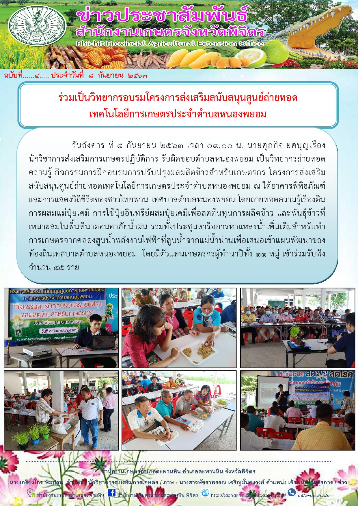 วันอังคาร ที่ 8 กันยายน 2563 เวลา 09.00 น. นายศุภกิจ ยศบุญเรือง นักวิชาการส่งเสริมการเกษตรปฏิบัติการ รับผิดชอบตำบลหนองพยอม เป็นวิทยากรถ่ายทอดความรู้ กิจกรรมการฝึกอบรมการปรับปรุงผลผลิตข้าวสำหรับเกษตรกร โครงการส่งเสริมสนับสนุนศูนย์ถ่ายทอดเทคโนโลยีการเกษตรประจำตำบลหนองพยอม ณ ใต้อาคารพิพิธภัณฑ์และการแสดงวิถีชีวิตของชาวไทยพวน เทศบาลตำบลหนองพยอม โดยถ่ายทอดความรู้เรื่องดิน การผสมแม่ปุ๋ยเคมี การใช้ปุ๋ยอินทรีย์ผสมปุ๋ยเคมีเพื่อลดต้นทุนการผลิตข้าว และพันธุ์ข้าวที่เหมาะสมในพื้นที่นาดอนอาศัยน้ำฝน รวมทั้งประชุมหารือการหาแหล่งน้ำเพิ่มเติมสำหรับทำการเกษตรจากคลองสูบน้ำพลังงานไฟฟ้าที่สูบน้ำจากแม่น้ำน่านเพื่อเสนอเข้าแผนพัฒนาของท้องถิ่นเทศบาลตำบลหนองพยอม โดยมีตัวแทนเกษตรกรผู้ทำนาปีทั้ง 11 หมู่ เข้าร่วมรับฟังจำนวน 45 ราย