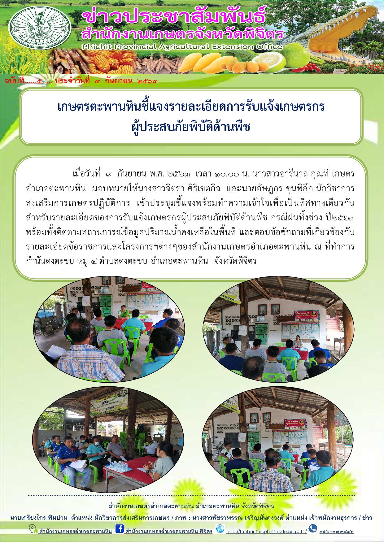 เมื่อวันที่ 9 กันยายน พ.ศ. ๒๕๖๓ เวลา 10.00 น. นาวสาวอารีนาถ กุณที เกษตรอำเภอตะพานหิน มอบหมายให้นางสาวจิตรา ศิริเขตกิจ และนายอัษฎกร ขุนพิลึก นักวิชาการส่งเสริมการเกษตรปฏิบัติการ เข้าประชุมชี้แจงพร้อมทำความเข้าใจเพื่อเป็นทิศทางเดียวกัน สำหรับรายละเอียดของการรับแจ้งเกษตรกรผู้ประสบภัยพิบัติด้านพืช กรณีฝนทิ้งช่วง ปี2563 พร้อมทั้งติดตามสถานการณ์ข้อมูลปริมาณน้ำคงเหลือในพื้นที่ และตอบข้อซักถามที่เกี่ยวข้องกับรายละเอียดข้อราชการและโครงการฯต่างๆของสำนักงานเกษตรอำเภอตะพานหิน ณ ที่ทำการกำนันดงตะขบ หมู่ 4 ตำบลดงตะขบ อำเภอตะพานหิน จังหวัดพิจิตร