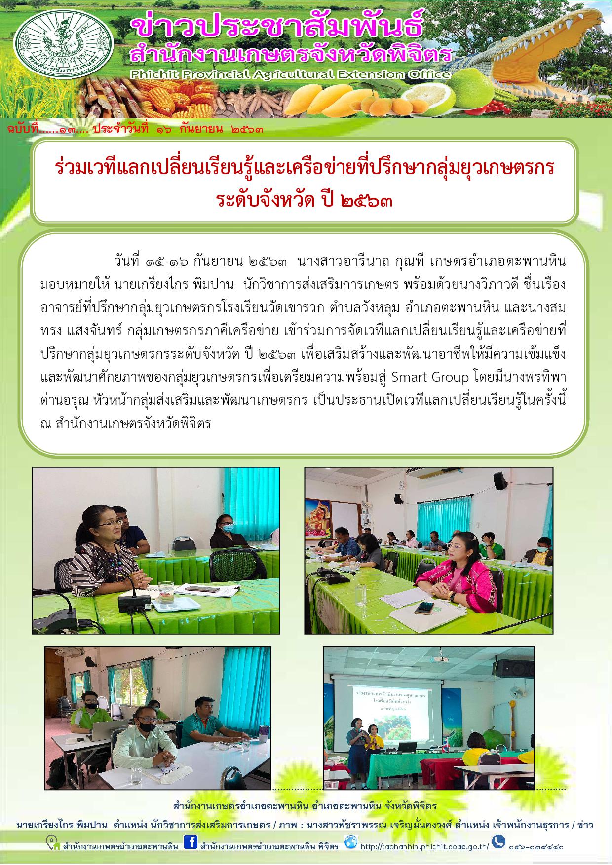 วันที่ 15-16 กันยายน 2563 นางสาวอารีนาถ กุณที เกษตรอำเภอตะพานหิน มอบหมายให้ นายเกรียงไกร พิมปาน นักวิชาการส่งเสริมการเกษตร พร้อมด้วยนางวิภาวดี ชื่นเรือง อาจารย์ที่ปรึกษากลุ่มยุวเกษตรกรโรงเรียนวัดเขารวก ตำบลวังหลุม อำเภอตะพานหิน และนางสมทรง แสงจันทร์ กลุ่มเกษตรกรภาคีเครือข่าย เข้าร่วมการจัดเวทีแลกเปลี่ยนเรียนรู้และเครือข่ายที่ปรึกษากลุ่มยุวเกษตรกรระดับจังหวัด ปี 2563 เพื่อเสริมสร้างและพัฒนาอาชีพให้มีความเข้มแข็งและพัฒนาศักยภาพของกลุ่มยุวเกษตรกรเพื่อเตรียมความพร้อมสู่ Smart Group โดยมีนางพรทิพา ด่านอรุณ หัวหน้ากลุ่มส่งเสริมและพัฒนาเกษตรกร เป็นประธานเปิดเวทีแลกเปลี่ยนเรียนรู้ในครั้งนี้ ณ สำนักงานเกษตรจังหวัดพิจิตร