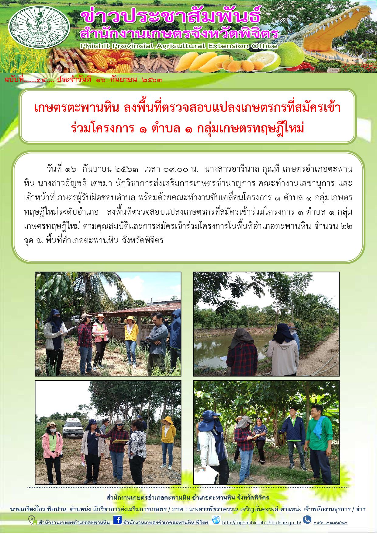 วันที่ 16 กันยายน 2563 เวลา 09.00 น. นางสาวอารีนาถ กุณที เกษตรอำเภอตะพานหิน นางสาวอัญชลี เดชมา นักวิชาการส่งเสริมการเกษตรชำนาญการ คณะทำงานเลขานุการ และเจ้าหน้าที่เกษตรผู้รับผิดชอบตำบล พร้อมด้วยคณะทำงานขับเคลื่อนโครงการ 1 ตำบล 1 กลุ่มเกษตรทฤษฎีใหม่ระดับอำเภอ ลงพื้นที่ตรวจสอบแปลงเกษตรกรที่สมัครเข้าร่วมโครงการ 1 ตำบล 1 กลุ่มเกษตรทฤษฎีใหม่ ตามคุณสมบัติและการสมัครเข้าร่วมโครงการในพื้นที่อำเภอตะพานหิน จำนวน 22 จุด ณ พื้นที่อำเภอตะพานหิน จังหวัดพิจิตร