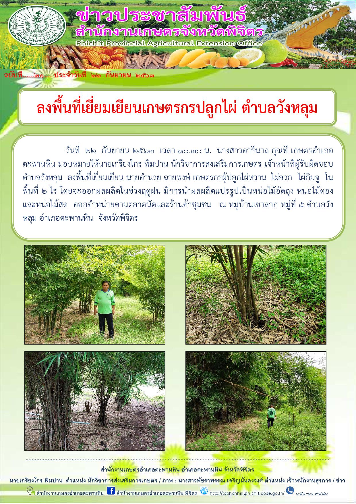 วันที่ 22 กันยายน 2563 เวลา 10.30 น. นางสาวอารีนาถ กุณที เกษตรอำเภอตะพานหิน มอบหมายให้นายเกรียงไกร พิมปาน นักวิชาการส่งเสริมการเกษตร เจ้าหน้าที่ผู้รับผิดชอบตำบลวังหลุม ลงพื้นที่เยี่ยมเยียน นายอำนวย ฉายพงษ์ เกษตรกรผู้ปลูกไผ่หวาน ไผ่ลวก ไผ่กิมจู ในพื้นที่ 2 ไร่ โดยจะออกผลผลิตในช่วงฤดูฝน มีการนำผลผลิตแปรรูปเป็นหน่อไม้อัดถุง หน่อไม้ดอง และหน่อไม้สด ออกจำหน่ายตามตลาดนัดและร้านค้าชุมชน ณ หมู่บ้านเขาลวก หมู่ที่ 5 ตำบลวังหลุม อำเภอตะพานหิน จังหวัดพิจิตร