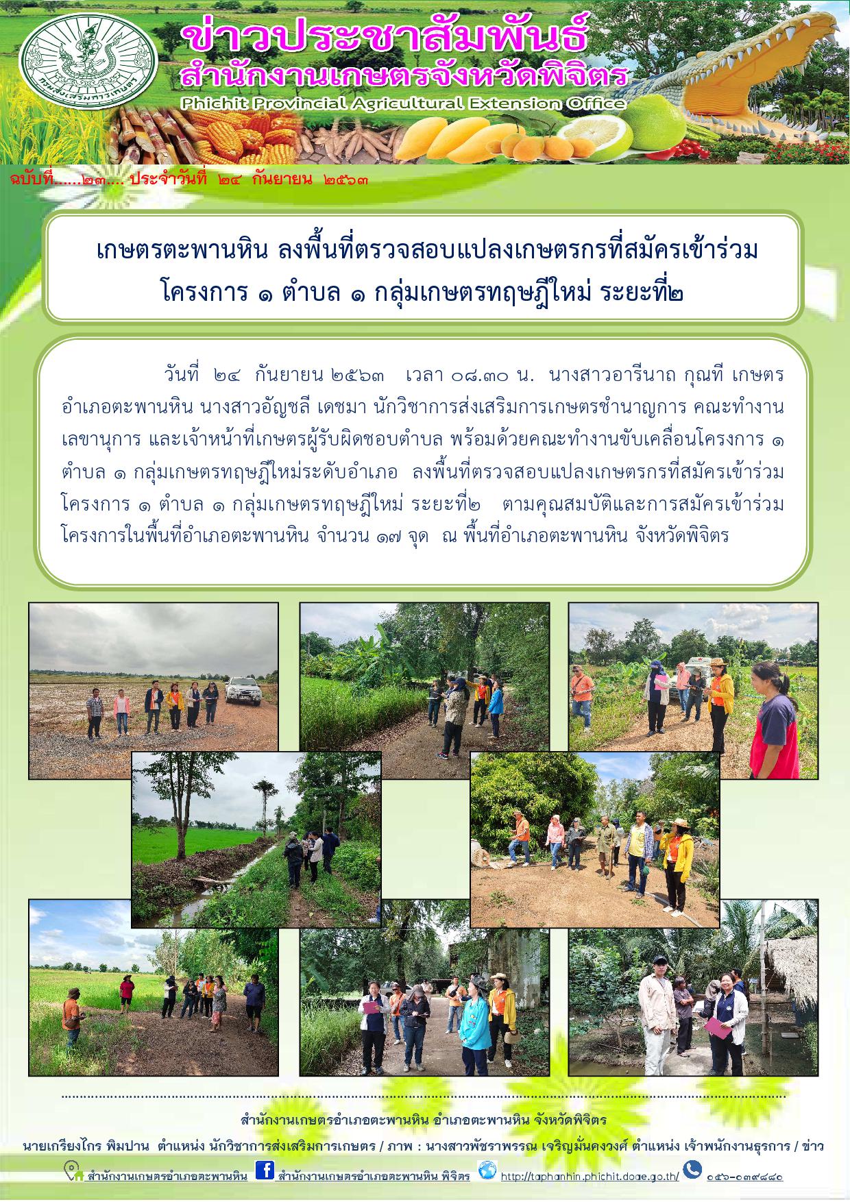 วันที่ 24 กันยายน 2563 เวลา 08.30 น. นางสาวอารีนาถ กุณที เกษตรอำเภอตะพานหิน นางสาวอัญชลี เดชมา นักวิชาการส่งเสริมการเกษตรชำนาญการ คณะทำงานเลขานุการ และเจ้าหน้าที่เกษตรผู้รับผิดชอบตำบล พร้อมด้วยคณะทำงานขับเคลื่อนโครงการ 1 ตำบล 1 กลุ่มเกษตรทฤษฎีใหม่ระดับอำเภอ ลงพื้นที่ตรวจสอบแปลงเกษตรกรที่สมัครเข้าร่วมโครงการ 1 ตำบล 1 กลุ่มเกษตรทฤษฎีใหม่ ระยะที่2 ตามคุณสมบัติและการสมัครเข้าร่วมโครงการในพื้นที่อำเภอตะพานหิน จำนวน 17 จุด ณ พื้นที่อำเภอตะพานหิน จังหวัดพิจิตร