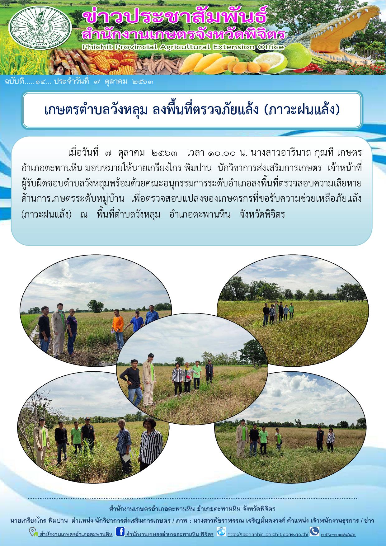เมื่อวันที่ 7 ตุลาคม 2563 เวลา 10.00 น. นางสาวอารีนาถ กุณที เกษตรอำเภอตะพานหิน มอบหมายให้นายเกรียงไกร พิมปาน นักวิชาการส่งเสริมการเกษตร เจ้าหน้าที่ผู้รับผิดชอบตำบลวังหลุมพร้อมด้วยคณะอนุกรรมการระดับอำเภอลงพื้นที่ตรวจสอบความเสียหายด้านการเกษตรระดับหมู่บ้าน เพื่อตรวจสอบแปลงของเกษตรกรที่ขอรับความช่วยเหลือภัยแล้ง (ภาวะฝนแล้ง) ณ พื้นที่ตำบลวังหลุม อำเภอตะพานหิน จังหวัดพิจิตร