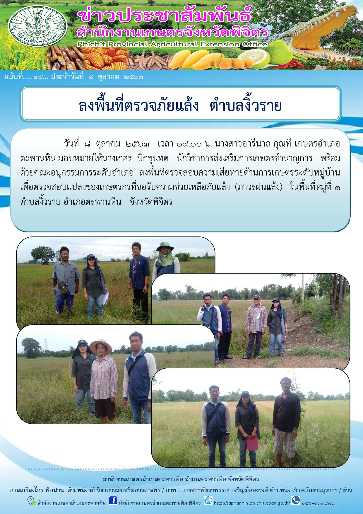 วันที่ 8 ตุลาคม 2563 เวลา 09.00 น. นางสาวอารีนาถ กุณที เกษตรอำเภอตะพานหิน มอบหมายให้นางเกสร บีกขุนทด นักวิชาการส่งเสริมการเกษตรชำนาญการ พร้อมด้วยคณะอนุกรรมการระดับอำเภอ ลงพื้นที่ตรวจสอบความเสียหายด้านการเกษตรระดับหมู่บ้าน เพื่อตรวจสอบแปลงของเกษตรกรที่ขอรับความช่วยเหลือภัยแล้ง (ภาวะฝนแล้ง) ในพื้นที่หมู่ที่ 1 ตำบลงิ้วราย อำเภอตะพานหิน จังหวัดพิจิตร
