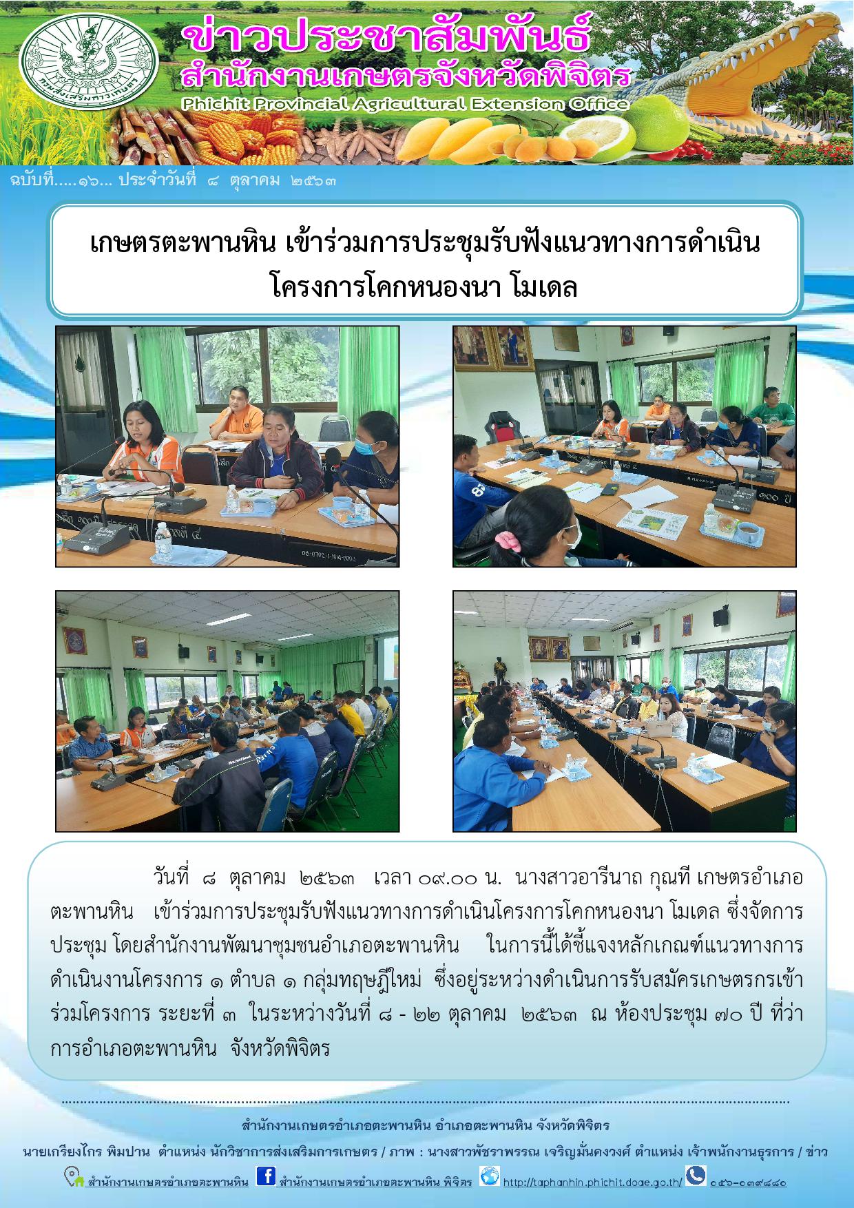 วันที่ 8 ตุลาคม 2563 เวลา 09.00 น. นางสาวอารีนาถ กุณที เกษตรอำเภอตะพานหิน เข้าร่วมการประชุมรับฟังแนวทางการดำเนินโครงการโคกหนองนา โมเดล ซึ่งจัดการประชุม โดยสำนักงานพัฒนาชุมชนอำเภอตะพานหิน ในการนี้ได้ชี้แจงหลักเกณฑ์แนวทางการดำเนินงานโครงการ 1 ตำบล 1 กลุ่มทฤษฎีใหม่ ซึ่งอยู่ระหว่างดำเนินการรับสมัครเกษตรกรเข้าร่วมโครงการ ระยะที่ 3 ในระหว่างวันที่ 8 – 22 ตุลาคม 2563 ณ ห้องประชุม 70 ปี ที่ว่าการอำเภอตะพานหิน จังหวัดพิจิตร