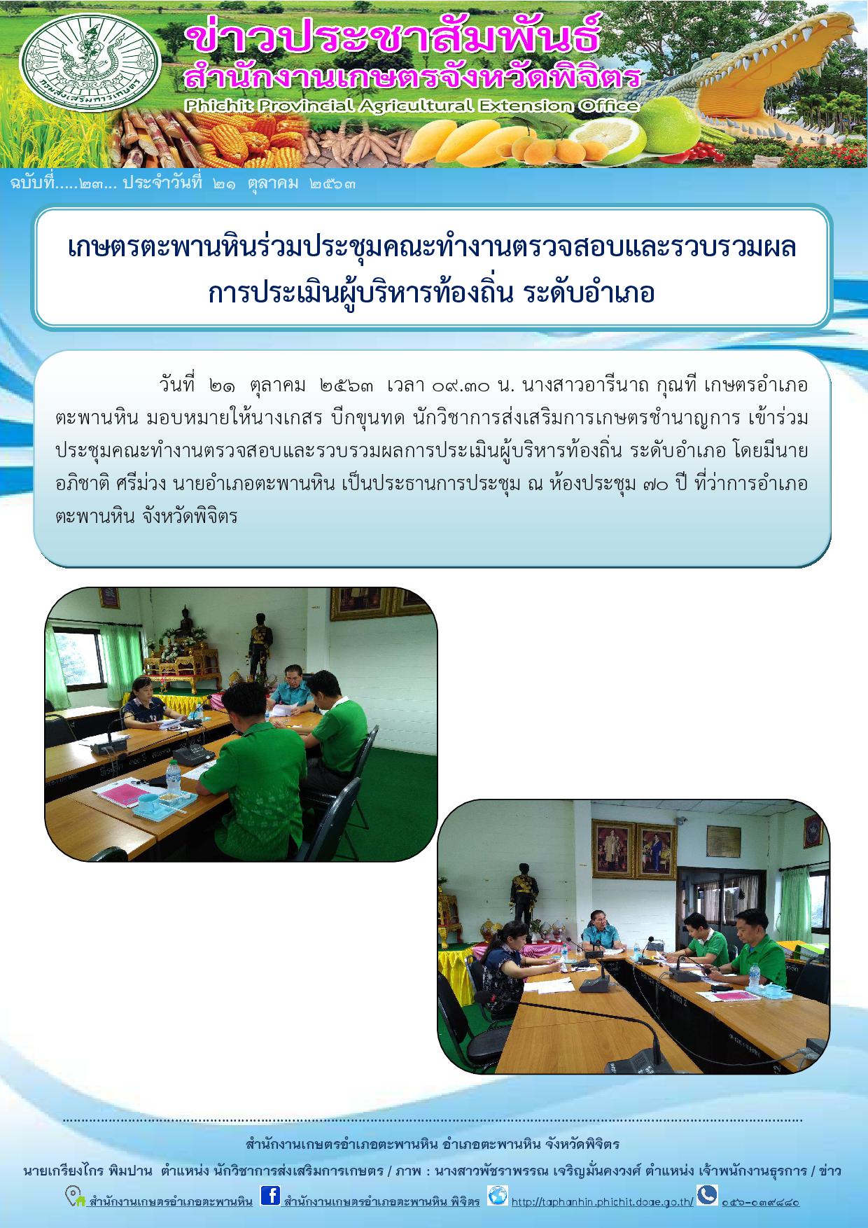 วันที่ 21 ตุลาคม 2563 เวลา 09.30 น. นางสาวอารีนาถ กุณที เกษตรอำเภอตะพานหิน มอบหมายให้นางเกสร บีกขุนทด นักวิชาการส่งเสริมการเกษตรชำนาญการ เข้าร่วมประชุมคณะทำงานตรวจสอบและรวบรวมผลการประเมินผู้บริหารท้องถิ่น ระดับอำเภอ โดยมีนายอภิชาติ ศรีม่วง นายอำเภอตะพานหิน เป็นประธานการประชุม ณ ห้องประชุม 70 ปี ที่ว่าการอำเภอตะพานหิน จังหวัดพิจิตร