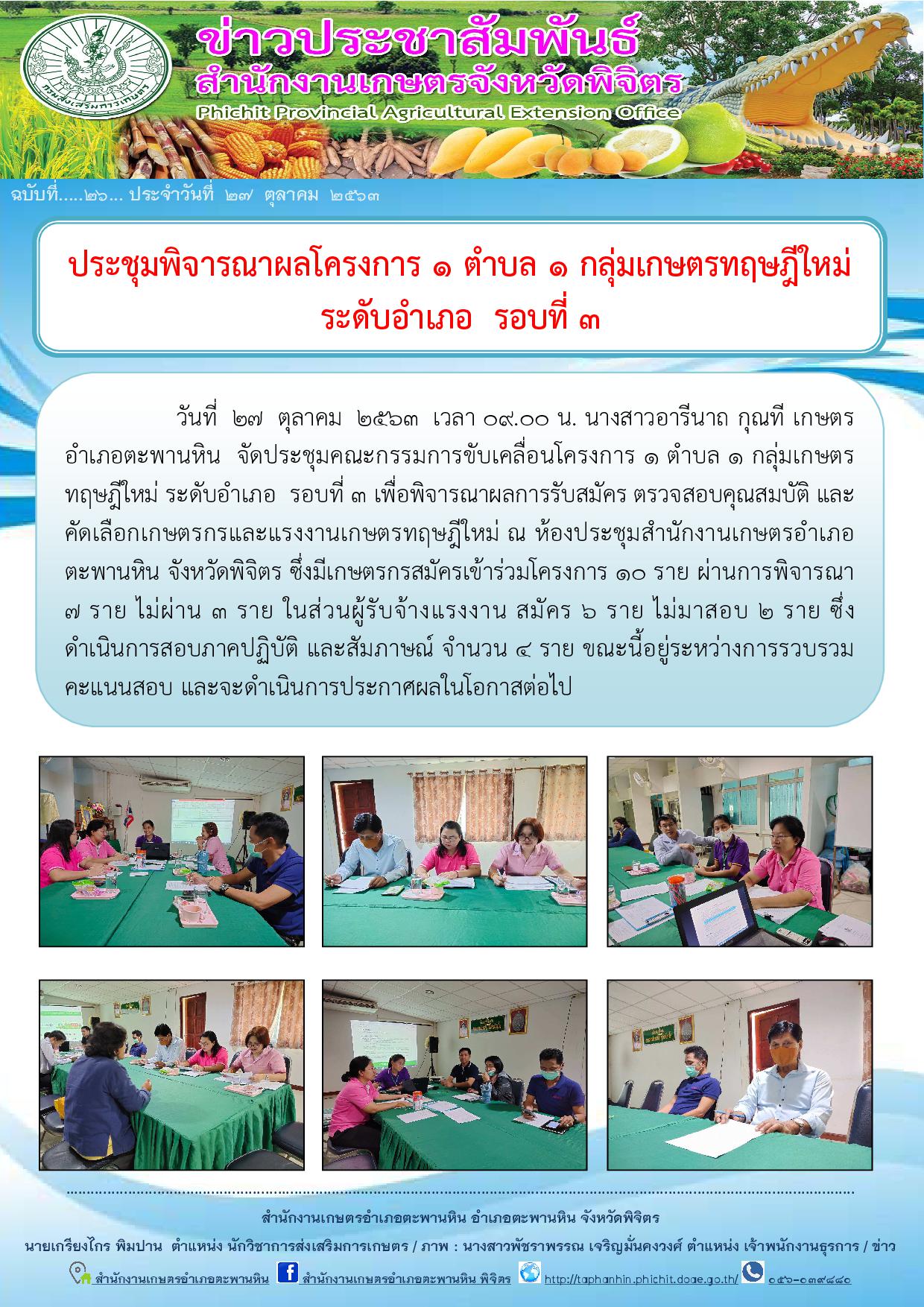 วันที่ 27 ตุลาคม 2563 เวลา 09.00 น. นางสาวอารีนาถ กุณที เกษตรอำเภอตะพานหิน จัดประชุมคณะกรรมการขับเคลื่อนโครงการ 1 ตำบล 1 กลุ่มเกษตรทฤษฎีใหม่ ระดับอำเภอ รอบที่ 3 เพื่อพิจารณาผลการรับสมัคร ตรวจสอบคุณสมบัติ และคัดเลือกเกษตรกรและแรงงานเกษตรทฤษฎีใหม่ ณ ห้องประชุมสำนักงานเกษตรอำเภอตะพานหิน จังหวัดพิจิตร ซึ่งมีเกษตรกรสมัครเข้าร่วมโครงการ 10 ราย ผ่านการพิจารณา 7 ราย ไม่ผ่าน 3 ราย ในส่วนผู้รับจ้างแรงงาน สมัคร 6 ราย ไม่มาสอบ 2 ราย ซึ่งดำเนินการสอบภาคปฏิบัติ และสัมภาษณ์ จำนวน 4 ราย ขณะนี้อยู่ระหว่างการรวบรวมคะแนนสอบ และจะดำเนินการประกาศผลในโอกาสต่อไป