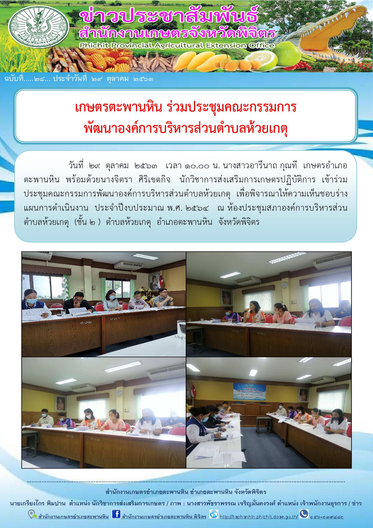 วันที่ 29 ตุลาคม 2563 เวลา 10.00 น. นางสาวอารีนาถ กุณที เกษตรอำเภอตะพานหิน พร้อมด้วยนางจิตรา ศิริเขตกิจ นักวิชาการส่งเสริมการเกษตรปฏิบัติการ เข้าร่วมประชุมคณะกรรมการพัฒนาองค์การบริหารส่วนตำบลห้วยเกตุ เพื่อพิจารณาให้ความเห็นชอบร่างแผนการดำเนินงาน ประจำปีงบประมาณ พ.ศ. 2564 ณ ห้องประชุมสภาองค์การบริหารส่วนตำบลห้วยเกตุ (ชั้น 2 ) ตำบลห้วยเกตุ อำเภอตะพานหิน จังหวัดพิจิตร