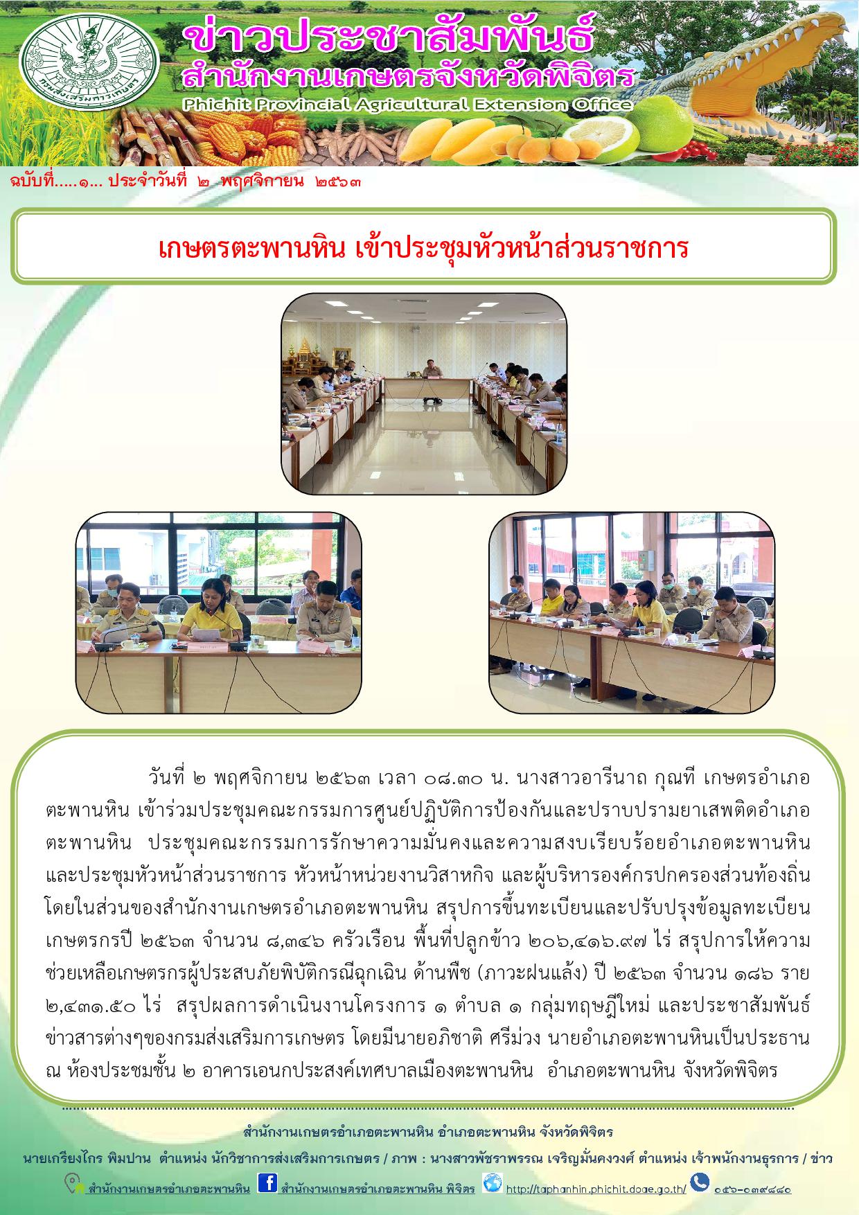 วันที่ 2 พฤศจิกายน 2563 เวลา 08.30 น. นางสาวอารีนาถ กุณที เกษตรอำเภอตะพานหิน เข้าร่วมประชุมคณะกรรมการศูนย์ปฏิบัติการป้องกันและปราบปรามยาเสพติดอำเภอตะพานหิน ประชุมคณะกรรมการรักษาความมั่นคงและความสงบเรียบร้อยอำเภอตะพานหิน และประชุมหัวหน้าส่วนราชการ หัวหน้าหน่วยงานวิสาหกิจ และผู้บริหารองค์กรปกครองส่วนท้องถิ่น โดยในส่วนของสำนักงานเกษตรอำเภอตะพานหิน สรุปการขึ้นทะเบียนและปรับปรุงข้อมูลทะเบียนเกษตรกรปี 2563 จำนวน 8,346 ครัวเรือน พื้นที่ปลูกข้าว 206,416.97 ไร่ สรุปการให้ความช่วยเหลือเกษตรกรผู้ประสบภัยพิบัติกรณีฉุกเฉิน ด้านพืช (ภาวะฝนแล้ง) ปี 2563 จำนวน 186 ราย 2,431.50 ไร่ สรุปผลการดำเนินงานโครงการ 1 ตำบล 1 กลุ่มทฤษฎีใหม่ และประชาสัมพันธ์ข่าวสารต่างๆของกรมส่งเสริมการเกษตร โดยมีนายอภิชาติ ศรีม่วง นายอำเภอตะพานหินเป็นประธาน ณ ห้องประชุมชั้น 2 อาคารเอนกประสงค์เทศบาลเมืองตะพานหิน อำเภอตะพานหิน จังหวัดพิจิตร
