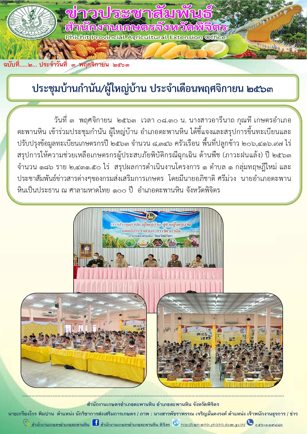 วันที่ 3 พฤศจิกายน 2563 เวลา 08.30 น. นางสาวอารีนาถ กุณที เกษตรอำเภอตะพานหิน เข้าร่วมประชุมกำนัน ผู้ใหญ่บ้าน อำเภอตะพานหิน ได้ชี้แจงและสรุปการขึ้นทะเบียนและปรับปรุงข้อมูลทะเบียนเกษตรกรปี 2563 จำนวน 8,346 ครัวเรือน พื้นที่ปลูกข้าว 206,416.97 ไร่ สรุปการให้ความช่วยเหลือเกษตรกรผู้ประสบภัยพิบัติกรณีฉุกเฉิน ด้านพืช (ภาวะฝนแล้ง) ปี 2563 จำนวน 186 ราย 2,431.50 ไร่ สรุปผลการดำเนินงานโครงการ 1 ตำบล 1 กลุ่มทฤษฎีใหม่ และประชาสัมพันธ์ข่าวสารต่างๆของกรมส่งเสริมการเกษตร โดยมีนายอภิชาติ ศรีม่วง นายอำเภอตะพานหินเป็นประธาน ณ ศาลามหาดไทย 100 ปี อำเภอตะพานหิน จังหวัดพิจิตร