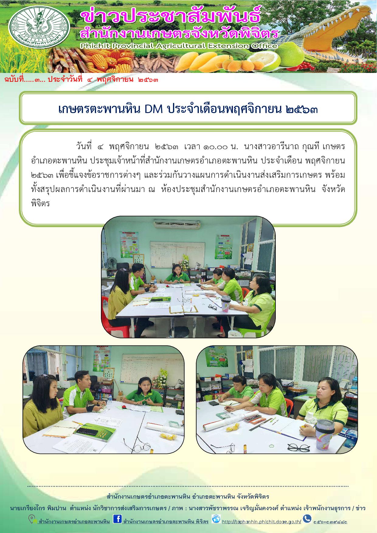 วันที่ 4 พฤศจิกายน 2563 เวลา 10.00 น. นางสาวอารีนาถ กุณที เกษตรอำเภอตะพานหิน ประชุมเจ้าหน้าที่สำนักงานเกษตรอำเภอตะพานหิน ประจำเดือน พฤศจิกายน 2563 เพื่อชี้แจงข้อราชการต่างๆ และร่วมกันวางแผนการดำเนินงานส่งเสริมการเกษตร พร้อมทั้งสรุปผลการดำเนินงานที่ผ่านมา ณ ห้องประชุมสำนักงานเกษตรอำเภอตะพานหิน จังหวัดพิจิตร