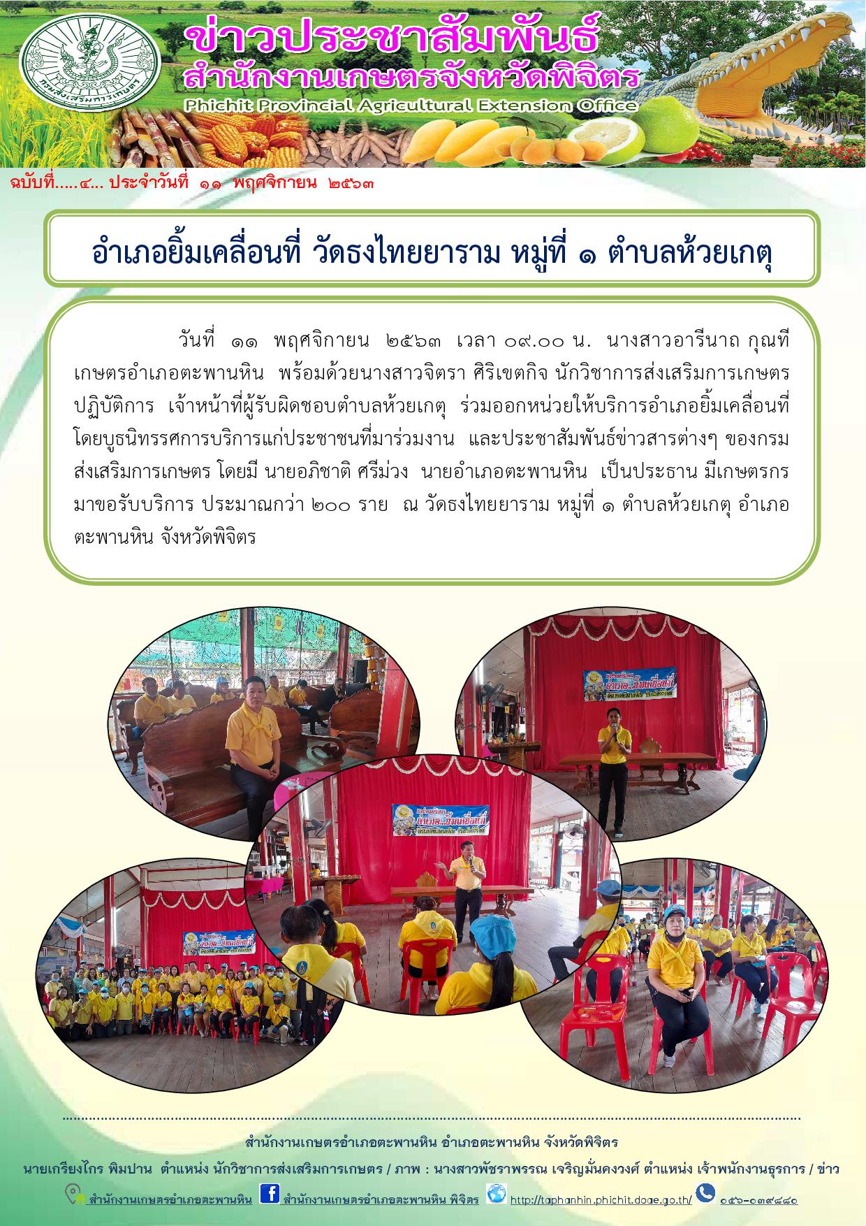 วันที่ 11 พฤศจิกายน 2563 เวลา 09.00 น. นางสาวอารีนาถ กุณที เกษตรอำเภอตะพานหิน พร้อมด้วยนางสาวจิตรา ศิริเขตกิจ นักวิชาการส่งเสริมการเกษตรปฏิบัติการ เจ้าหน้าที่ผู้รับผิดชอบตำบลห้วยเกตุ ร่วมออกหน่วยให้บริการอำเภอยิ้มเคลื่อนที่ โดยบูธนิทรรศการบริการแก่ประชาชนที่มาร่วมงาน และประชาสัมพันธ์ข่าวสารต่างๆ ของกรมส่งเสริมการเกษตร โดยมี นายอภิชาติ ศรีม่วง นายอำเภอตะพานหิน เป็นประธาน มีเกษตรกรมาขอรับบริการ ประมาณกว่า 200 ราย ณ วัดธงไทยยาราม หมู่ที่ 1 ตำบลห้วยเกตุ อำเภอตะพานหิน จังหวัดพิจิตร