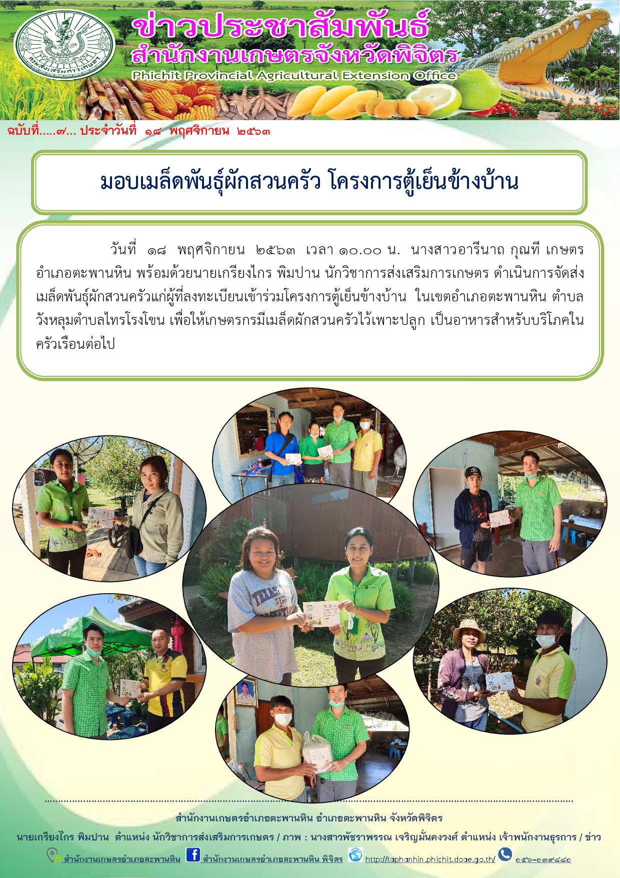 วันที่ 18 พฤศจิกายน 2563 เวลา 10.00 น. นางสาวอารีนาถ กุณที เกษตรอำเภอตะพานหิน พร้อมด้วยนายเกรียงไกร พิมปาน นักวิชาการส่งเสริมการเกษตร ดำเนินการจัดส่งเมล็ดพันธุ์ผักสวนครัวแก่ผู้ที่ลงทะเบียนเข้าร่วมโครงการตู้เย็นข้างบ้าน ในเขตอำเภอตะพานหิน ตำบลวังหลุมตำบลไทรโรงโขน เพื่อให้เกษตรกรมีเมล็ดผักสวนครัวไว้เพาะปลูก เป็นอาหารสำหรับบริโภคในครัวเรือนต่อไป