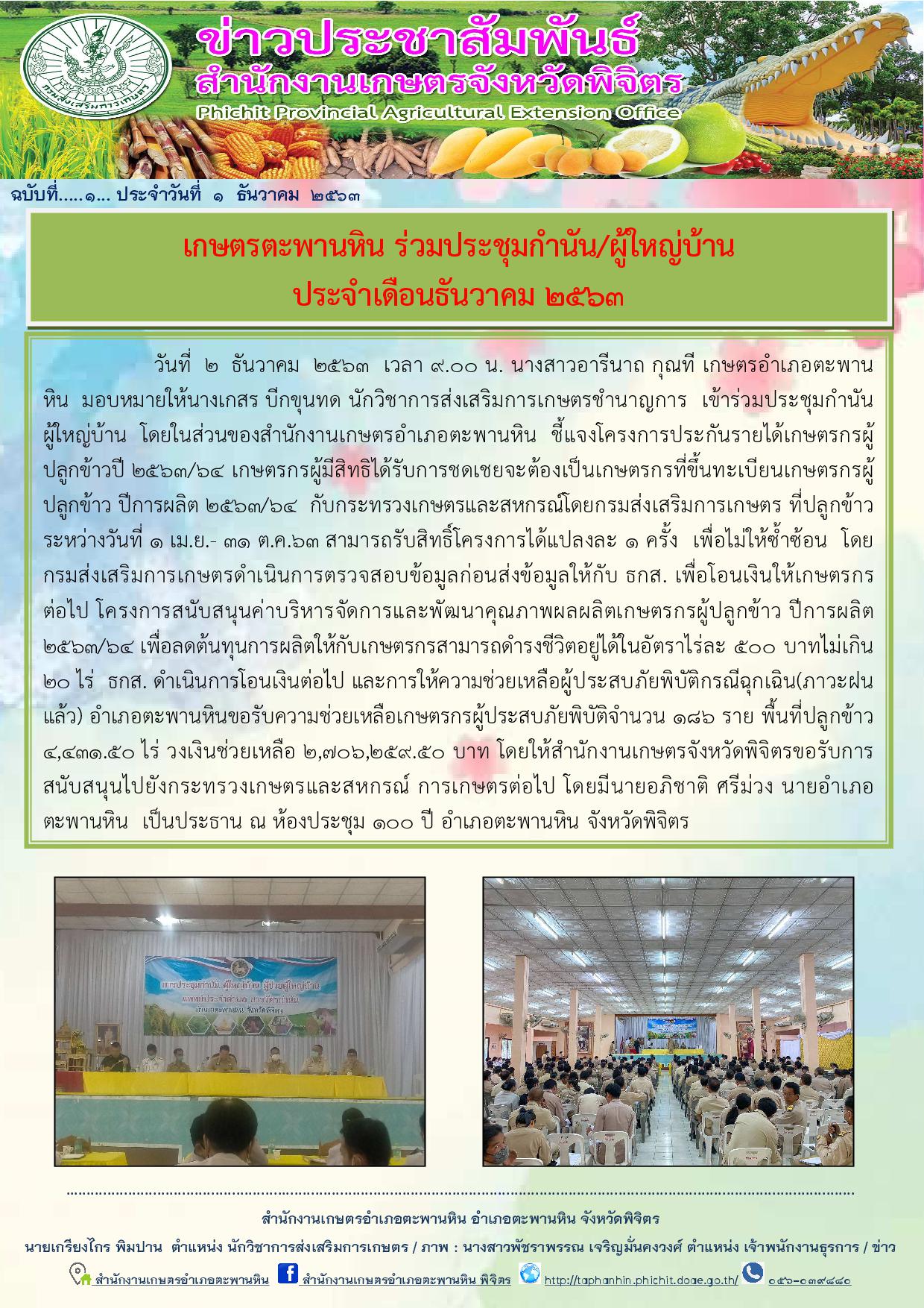 วันที่ 2 ธันวาคม 2563 เวลา 9.00 น. นางสาวอารีนาถ กุณที เกษตรอำเภอตะพานหิน มอบหมายให้นางเกสร บีกขุนทด นักวิชาการส่งเสริมการเกษตรชำนาญการ เข้าร่วมประชุมกำนัน ผู้ใหญ่บ้าน โดยในส่วนของสำนักงานเกษตรอำเภอตะพานหิน ชี้แจงโครงการประกันรายได้เกษตรกรผู้ปลูกข้าวปี 2563/64 เกษตรกรผู้มีสิทธิได้รับการชดเชยจะต้องเป็นเกษตรกรที่ขึ้นทะเบียนเกษตรกรผู้ปลูกข้าว ปีการผลิต 2563/64 กับกระทรวงเกษตรและสหกรณ์โดยกรมส่งเสริมการเกษตร ที่ปลูกข้าวระหว่างวันที่ 1 เม.ย.- 31 ต.ค.63 สามารถรับสิทธิ์โครงการได้แปลงละ 1 ครั้ง เพื่อไม่ให้ซ้ำซ้อน โดยกรมส่งเสริมการเกษตรดำเนินการตรวจสอบข้อมูลก่อนส่งข้อมูลให้กับ ธกส. เพื่อโอนเงินให้เกษตรกรต่อไป โครงการสนับสนุนค่าบริหารจัดการและพัฒนาคุณภาพผลผลิตเกษตรกรผู้ปลูกข้าว ปีการผลิต 2563/64 เพื่อลดต้นทุนการผลิตให้กับเกษตรกรสามารถดำรงชีวิตอยู่ได้ในอัตราไร่ละ 500 บาทไม่เกิน 20 ไร่ ธกส. ดำเนินการโอนเงินต่อไป และการให้ความช่วยเหลือผู้ประสบภัยพิบัติกรณีฉุกเฉิน(ภาวะฝนแล้ว) อำเภอตะพานหินขอรับความช่วยเหลือเกษตรกรผู้ประสบภัยพิบัติจำนวน 186 ราย พื้นที่ปลูกข้าว 4,431.50 ไร่ วงเงินช่วยเหลือ 2,706,259.50 บาท โดยให้สำนักงานเกษตรจังหวัดพิจิตรขอรับการสนับสนุนไปยังกระทรวงเกษตรและสหกรณ์ การเกษตรต่อไป โดยมีนายอภิชาติ ศรีม่วง นายอำเภอตะพานหิน เป็นประธาน ณ ห้องประชุม 100 ปี อำเภอตะพานหิน จังหวัดพิจิตร