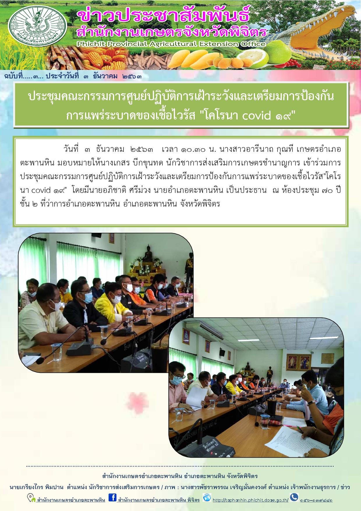วันที่ 3 ธันวาคม 2563 เวลา 10.30 น. นางสาวอารีนาถ กุณที เกษตรอำเภอตะพานหิน มอบหมายให้นางเกสร บีกขุนทด นักวิชาการส่งเสริมการเกษตรชำนาญการ เข้าร่วมการประชุมคณะกรรมการศูนย์ปฏิบัติการเฝ้าระวังและเตรียมการป้องกันการแพร่ระบาดของเชื้อไวรัส”โคโรนา covid 19″ โดยมีนายอภิชาติ ศรีม่วง นายอำเภอตะพานหิน เป็นประธาน ณ ห้องประชุม 70 ปีชั้น 2 ที่ว่าการอำเภอตะพานหิน อำเภอตะพานหิน จังหวัดพิจิตร