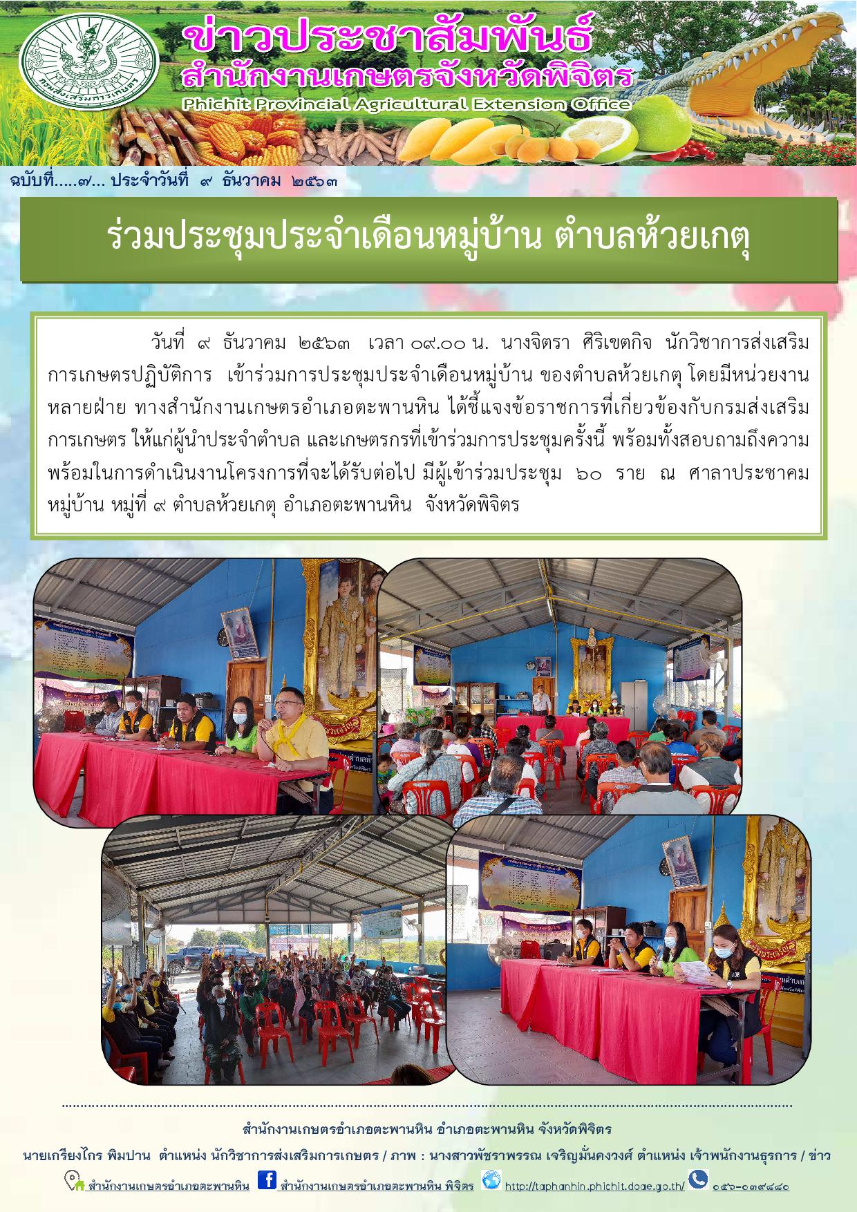 วันที่ 9 ธันวาคม 2563 เวลา 09.00 น. นางจิตรา ศิริเขตกิจ นักวิชาการส่งเสริมการเกษตรปฏิบัติการ เข้าร่วมการประชุมประจำเดือนหมู่บ้าน ของตำบลห้วยเกตุ โดยมีหน่วยงานหลายฝ่าย ทางสำนักงานเกษตรอำเภอตะพานหิน ได้ชี้แจงข้อราชการที่เกี่ยวข้องกับกรมส่งเสริมการเกษตร ให้แก่ผู้นำประจำตำบล และเกษตรกรที่เข้าร่วมการประชุมครั้งนี้ พร้อมทั้งสอบถามถึงความพร้อมในการดำเนินงานโครงการที่จะได้รับต่อไป มีผู้เข้าร่วมประชุม 60 ราย ณ ศาลาประชาคมหมู่บ้าน หมู่ที่ 9 ตำบลห้วยเกตุ อำเภอตะพานหิน จังหวัดพิจิตร