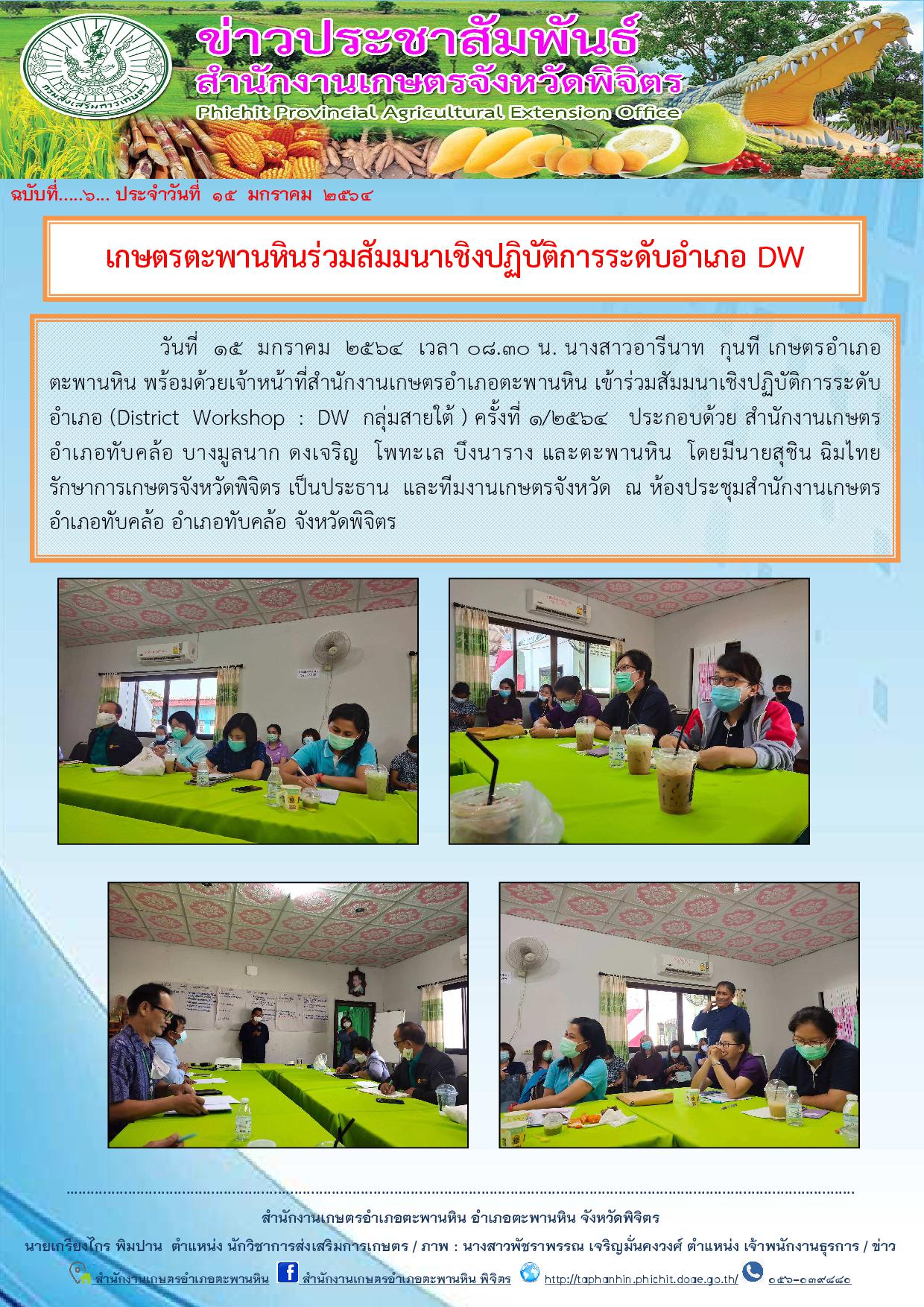 วันที่ 15 มกราคม 2564 เวลา ๐๘.๓๐ น. นางสาวอารีนาท กุนที เกษตรอำเภอตะพานหิน พร้อมด้วยเจ้าหน้าที่สำนักงานเกษตรอำเภอตะพานหิน เข้าร่วมสัมมนาเชิงปฏิบัติการระดับอำเภอ (District Workshop : DW กลุ่มสายใต้ ) ครั้งที่ ๑/๒๕๖๔ ประกอบด้วย สำนักงานเกษตรอำเภอทับคล้อ บางมูลนาก ดงเจริญ โพทะเล บึงนาราง และตะพานหิน โดยมีนายสุชิน ฉิมไทย รักษาการเกษตรจังหวัดพิจิตร เป็นประธาน และทีมงานเกษตรจังหวัด ณ ห้องประชุมสำนักงานเกษตรอำเภอทับคล้อ อำเภอทับคล้อ จังหวัดพิจิตร