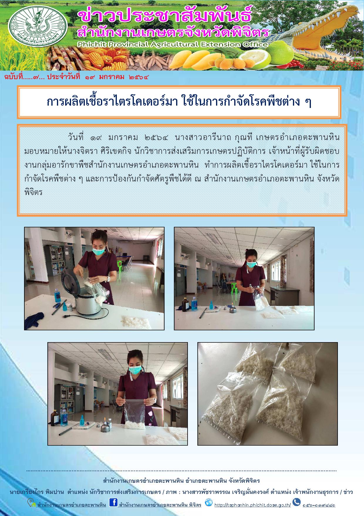 วันที่ 19 มกราคม 2564 นางสาวอารีนาถ กุณที เกษตรอำเภอตะพานหิน มอบหมายให้นางจิตรา ศิริเขตกิจ นักวิชาการส่งเสริมการเกษตรปฏิบัติการ เจ้าหน้าที่ผู้รับผิดชอบงานกลุ่มอารักขาพืชสำนักงานเกษตรอำเภอตะพานหิน ทำการผลิตเชื้อราไตรโคเดอร์มา ใช้ในการกำจัดโรคพืชต่าง ๆ และการป้องกันกำจัดศัตรูพืชได้ดี ณ สำนักงานเกษตรอำเภอตะพานหิน จังหวัดพิจิตร