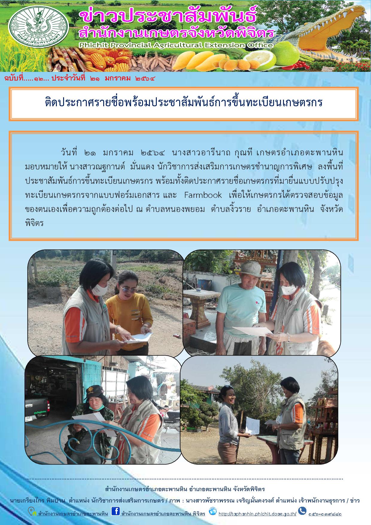 วันที่ 21 มกราคม 2564 นางสาวอารีนาถ กุณที เกษตรอำเภอตะพานหิน มอบหมายให้ นางสาวณฐกานต์ มั่นแดง นักวิชาการส่งเสริมการเกษตรชำนาญการพิเศษ ลงพื้นที่ประชาสัมพันธ์การขึ้นทะเบียนเกษตรกร พร้อมทั้งติดประกาศรายชื่อเกษตรกรที่มายื่นแบบปรับปรุงทะเบียนเกษตรกรจากแบบฟอร์มเอกสาร และ Farmbook เพื่อให้เกษตรกรได้ตรวจสอบข้อมูลของตนเองเพื่อความถูกต้องต่อไป ณ ตำบลหนองพยอม ตำบลงิ้วราย อำเภอตะพานหิน จังหวัดพิจิตร
