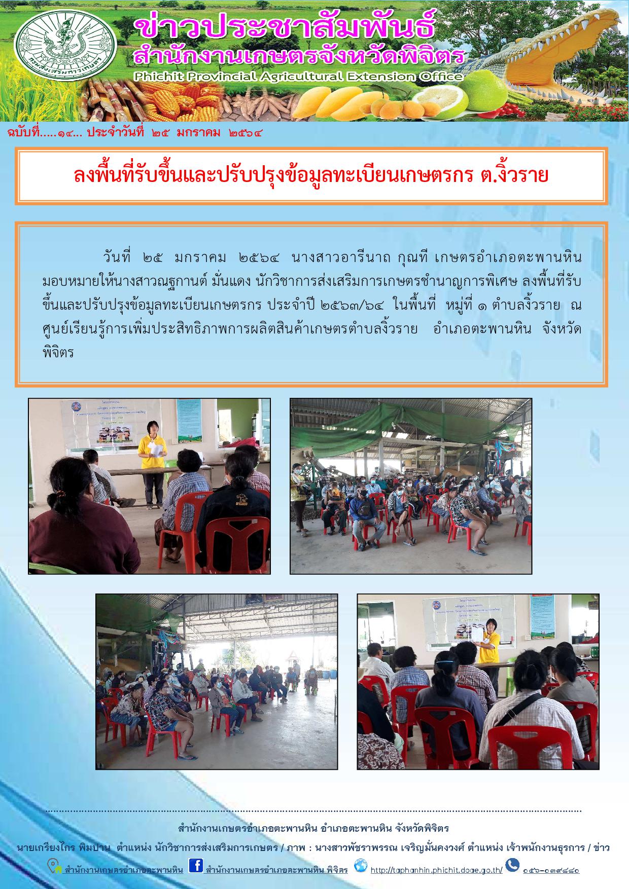 วันที่ 25 มกราคม 2564 นางสาวอารีนาถ กุณที เกษตรอำเภอตะพานหิน มอบหมายให้นางสาวณฐกานต์ มั่นแดง นักวิชาการส่งเสริมการเกษตรชำนาญการพิเศษ ลงพื้นที่รับขึ้นและปรับปรุงข้อมูลทะเบียนเกษตรกร ประจำปี 2563/64 ในพื้นที่ หมู่ที่ 1 ตำบลงิ้วราย ณ ศูนย์เรียนรู้การเพิ่มประสิทธิภาพการผลิตสินค้าเกษตรตำบลงิ้วราย อำเภอตะพานหิน จังหวัดพิจิตร