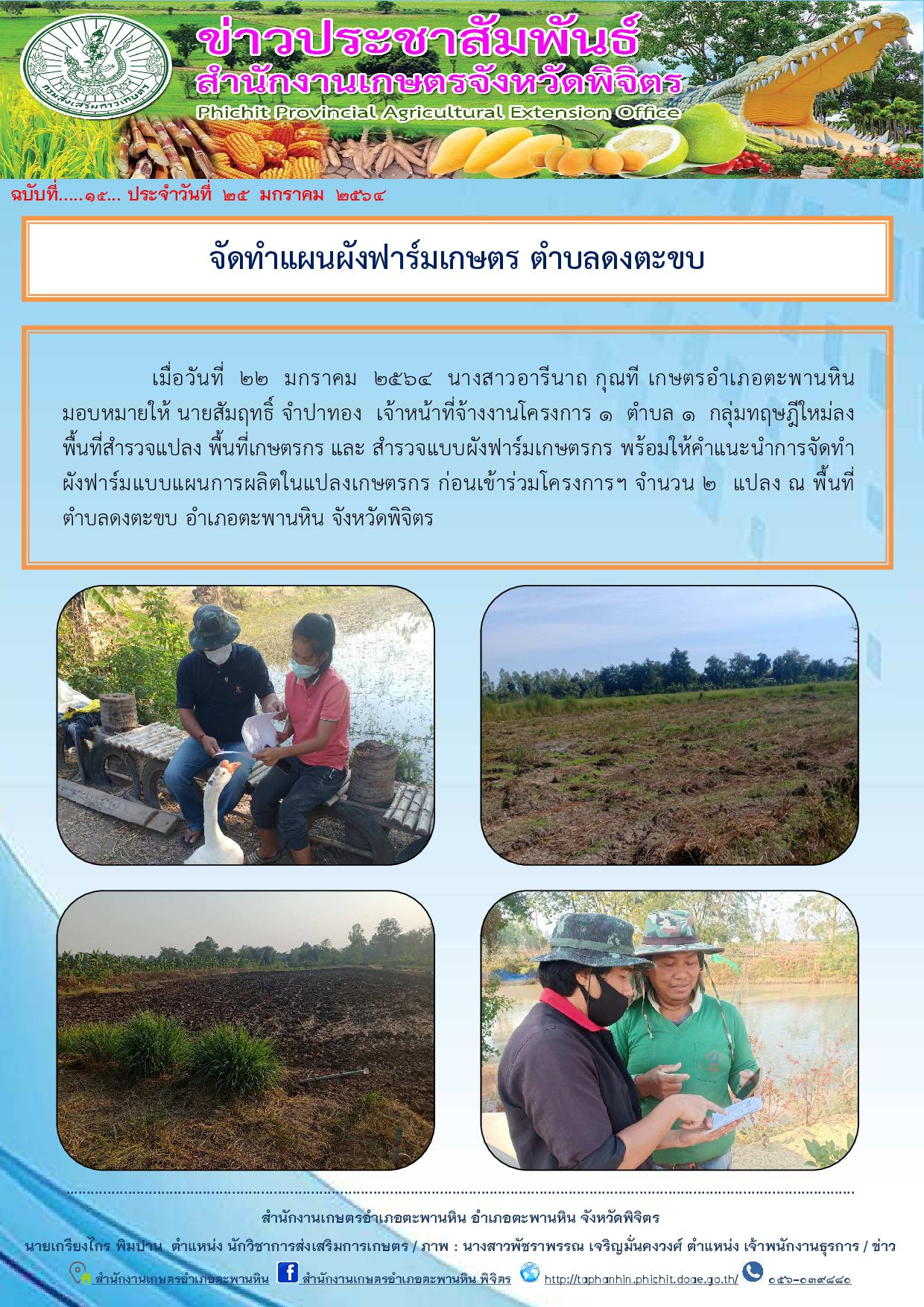 เมื่อวันที่ 22 มกราคม 2564 นางสาวอารีนาถ กุณที เกษตรอำเภอตะพานหิน มอบหมายให้ นายสัมฤทธิ์ จำปาทอง เจ้าหน้าที่จ้างงานโครงการ 1 ตำบล 1 กลุ่มทฤษฎีใหม่ลงพื้นที่สำรวจแปลง พื้นที่เกษตรกร และ สำรวจแบบผังฟาร์มเกษตรกร พร้อมให้คำแนะนำการจัดทำผังฟาร์มแบบแผนการผลิตในแปลงเกษตรกร ก่อนเข้าร่วมโครงการฯ จำนวน 2 แปลง ณ พื้นที่ตำบลดงตะขบ อำเภอตะพานหิน จังหวัดพิจิตร