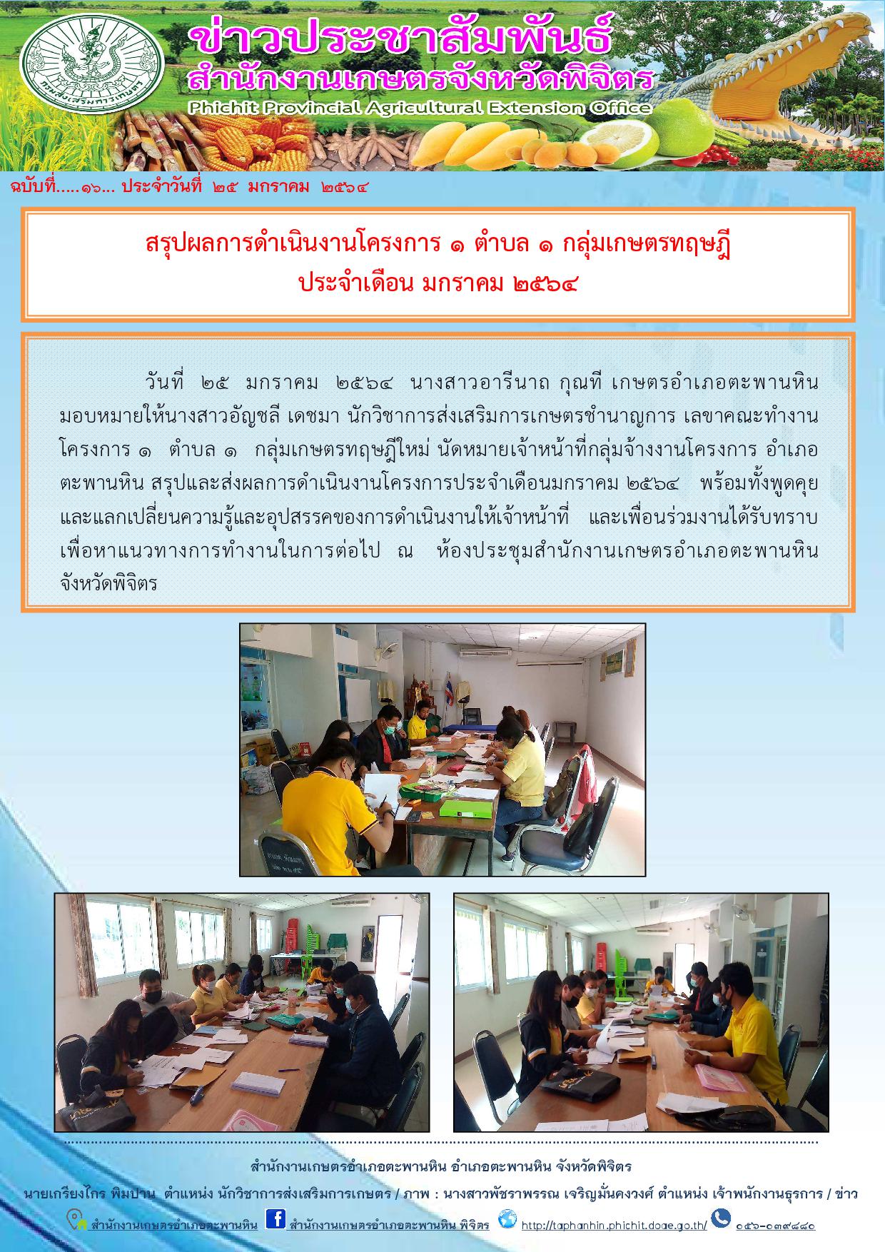 วันที่ 25 มกราคม 2564 นางสาวอารีนาถ กุณที เกษตรอำเภอตะพานหิน มอบหมายให้นางสาวอัญชลี เดชมา นักวิชาการส่งเสริมการเกษตรชำนาญการ เลขาคณะทำงานโครงการ 1 ตำบล 1 กลุ่มเกษตรทฤษฎีใหม่ นัดหมายเจ้าหน้าที่กลุ่มจ้างงานโครงการ อำเภอตะพานหิน สรุปและส่งผลการดำเนินงานโครงการประจำเดือนมกราคม 2564 พร้อมทั้งพูดคุยและแลกเปลี่ยนความรู้และอุปสรรคของการดำเนินงานให้เจ้าหน้าที่ และเพื่อนร่วมงานได้รับทราบเพื่อหาแนวทางการทำงานในการต่อไป ณ ห้องประชุมสำนักงานเกษตรอำเภอตะพานหิน จังหวัดพิจิตร