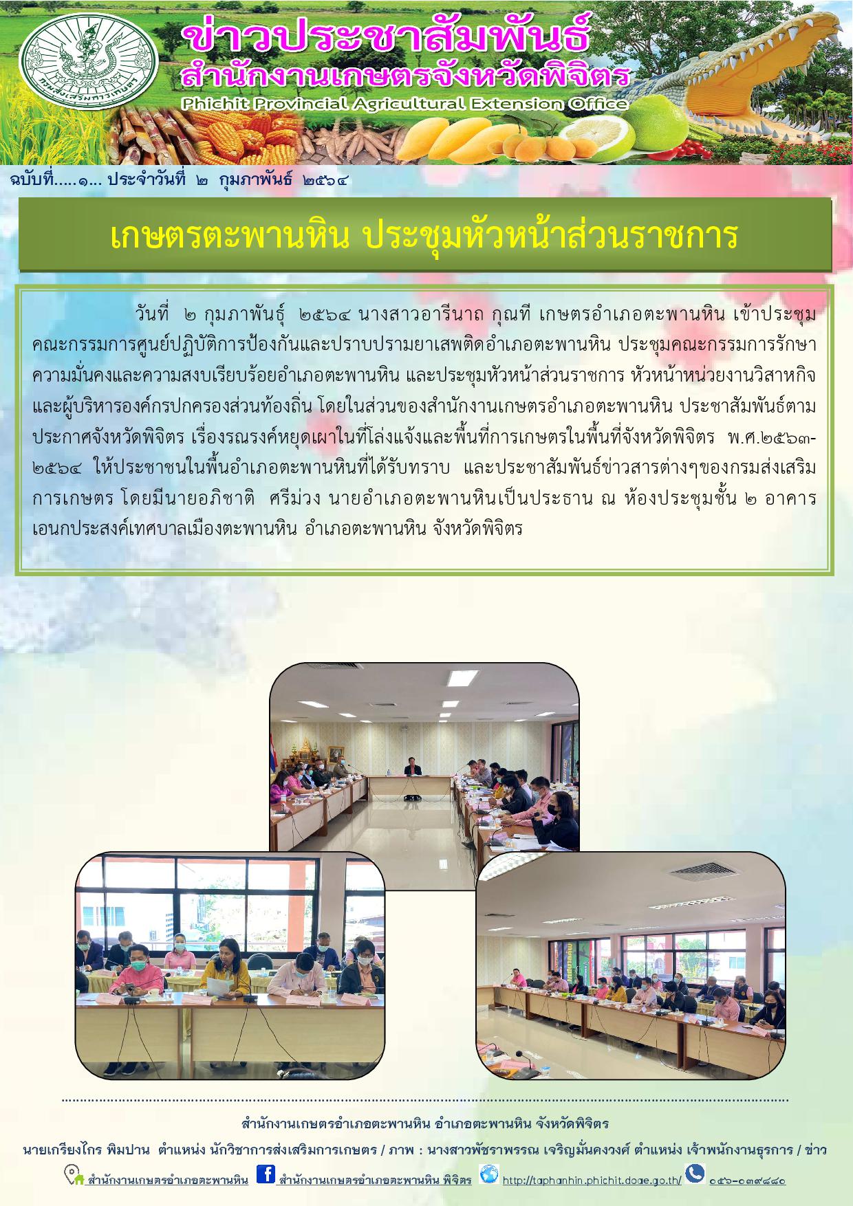 วันที่ 2 กุมภาพันธุ์ 2564 นางสาวอารีนาถ กุณที เกษตรอำเภอตะพานหิน เข้าประชุมคณะกรรมการศูนย์ปฏิบัติการป้องกันและปราบปรามยาเสพติดอำเภอตะพานหิน ประชุมคณะกรรมการรักษาความมั่นคงและความสงบเรียบร้อยอำเภอตะพานหิน และประชุมหัวหน้าส่วนราชการ หัวหน้าหน่วยงานวิสาหกิจ และผู้บริหารองค์กรปกครองส่วนท้องถิ่น โดยในส่วนของสำนักงานเกษตรอำเภอตะพานหิน ประชาสัมพันธ์ตามประกาศจังหวัดพิจิตร เรื่องรณรงค์หยุดเผาในที่โล่งแจ้งและพื้นที่การเกษตรในพื้นที่จังหวัดพิจิตร พ.ศ.2563-2564 ให้ประชาชนในพื้นอำเภอตะพานหินที่ได้รับทราบ และประชาสัมพันธ์ข่าวสารต่างๆของกรมส่งเสริมการเกษตร โดยมีนายอภิชาติ ศรีม่วง นายอำเภอตะพานหินเป็นประธาน ณ ห้องประชุมชั้น 2 อาคารเอนกประสงค์เทศบาลเมืองตะพานหิน อำเภอตะพานหิน จังหวัดพิจิตร