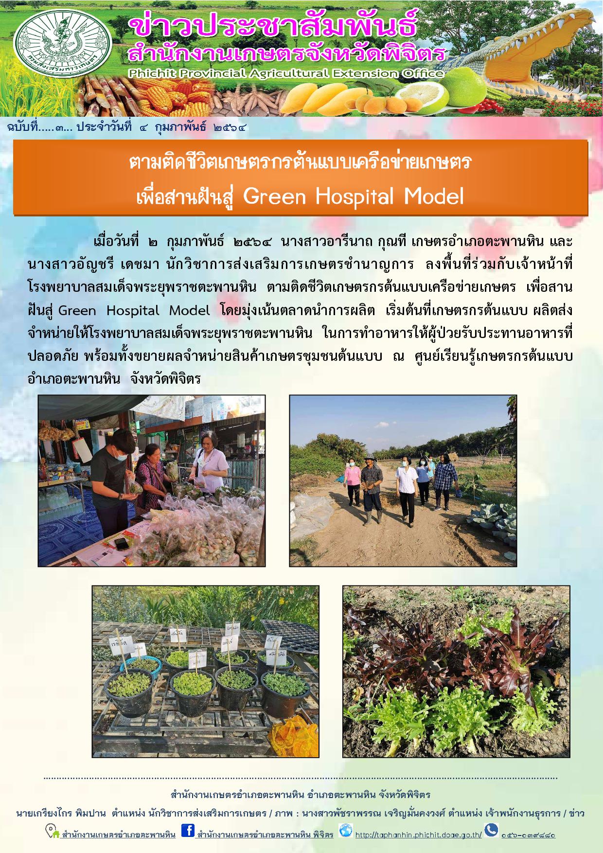 เมื่อวันที่ 2 กุมภาพันธ์ 2564 นางสาวอารีนาถ กุณที เกษตรอำเภอตะพานหิน และนางสาวอัญชรี เดชมา นักวิชาการส่งเสริมการเกษตรชำนาญการ ลงพื้นที่ร่วมกับเจ้าหน้าที่โรงพยาบาลสมเด็จพระยุพราชตะพานหิน ตามติดชีวิตเกษตรกรต้นแบบเครือข่ายเกษตร เพื่อสานฝันสู่ Green Hospital Model โดยมุ่งเน้นตลาดนำการผลิต เริ่มต้นที่เกษตรกรต้นแบบ ผลิตส่งจำหน่ายให้โรงพยาบาลสมเด็จพระยุพราชตะพานหิน ในการทำอาหารให้ผู้ป่วยรับประทานอาหารที่ปลอดภัย พร้อมทั้งขยายผลจำหน่ายสินค้าเกษตรชุมชนต้นแบบ ณ ศูนย์เรียนรู้เกษตรกรต้นแบบ อำเภอตะพานหิน จังหวัดพิจิตร
