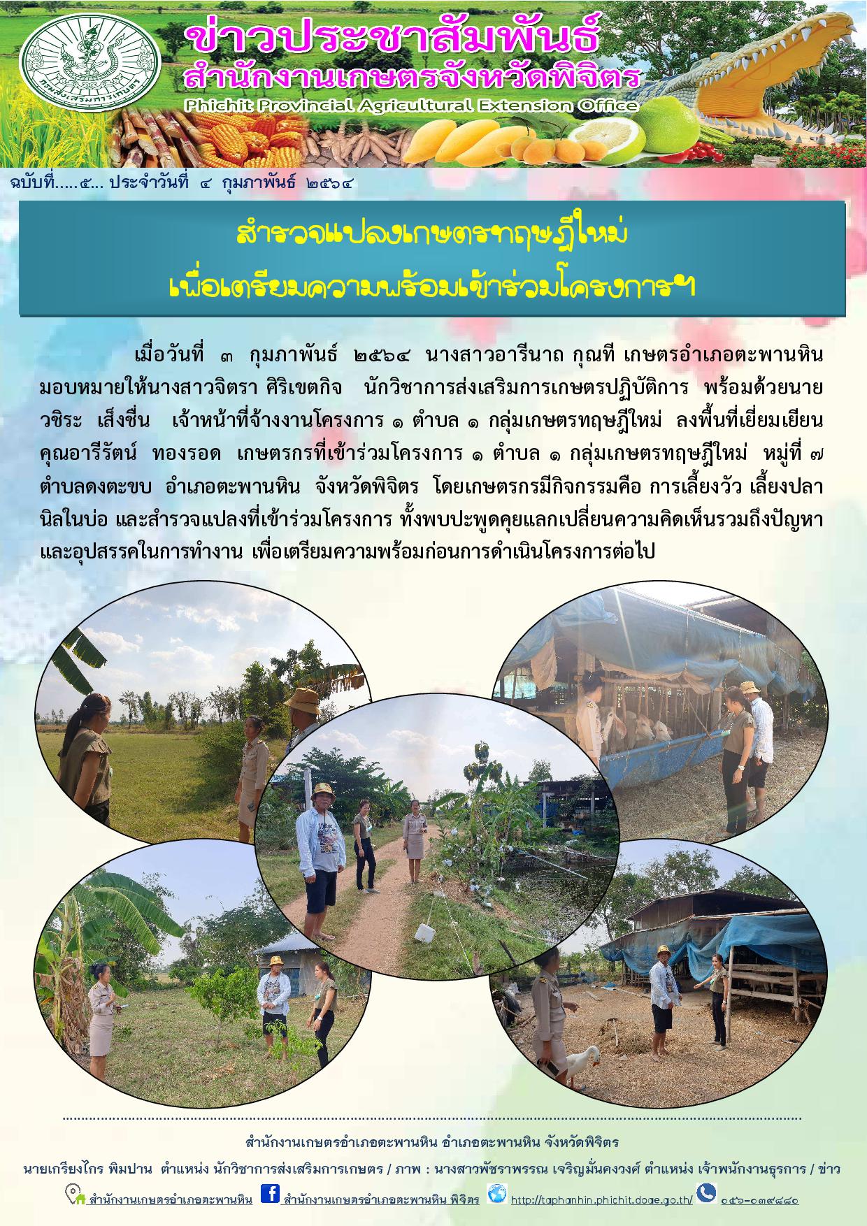 เมื่อวันที่ 3 กุมภาพันธ์ 2564 นางสาวอารีนาถ กุณที เกษตรอำเภอตะพานหิน มอบหมายให้นางสาวจิตรา ศิริเขตกิจ นักวิชาการส่งเสริมการเกษตรปฏิบัติการ พร้อมด้วยนายวชิระ เส็งชื่น เจ้าหน้าที่จ้างงานโครงการ 1 ตำบล 1 กลุ่มเกษตรทฤษฎีใหม่ ลงพื้นที่เยี่ยมเยียน คุณอารีรัตน์ ทองรอด เกษตรกรที่เข้าร่วมโครงการ 1 ตำบล 1 กลุ่มเกษตรทฤษฎีใหม่ หมู่ที่ 7 ตำบลดงตะขบ อำเภอตะพานหิน จังหวัดพิจิตร โดยเกษตรกรมีกิจกรรมคือ การเลี้ยงวัว เลี้ยงปลานิลในบ่อ และสำรวจแปลงที่เข้าร่วมโครงการ ทั้งพบปะพูดคุยแลกเปลี่ยนความคิดเห็นรวมถึงปัญหาและอุปสรรคในการทำงาน เพื่อเตรียมความพร้อมก่อนการดำเนินโครงการต่อไป