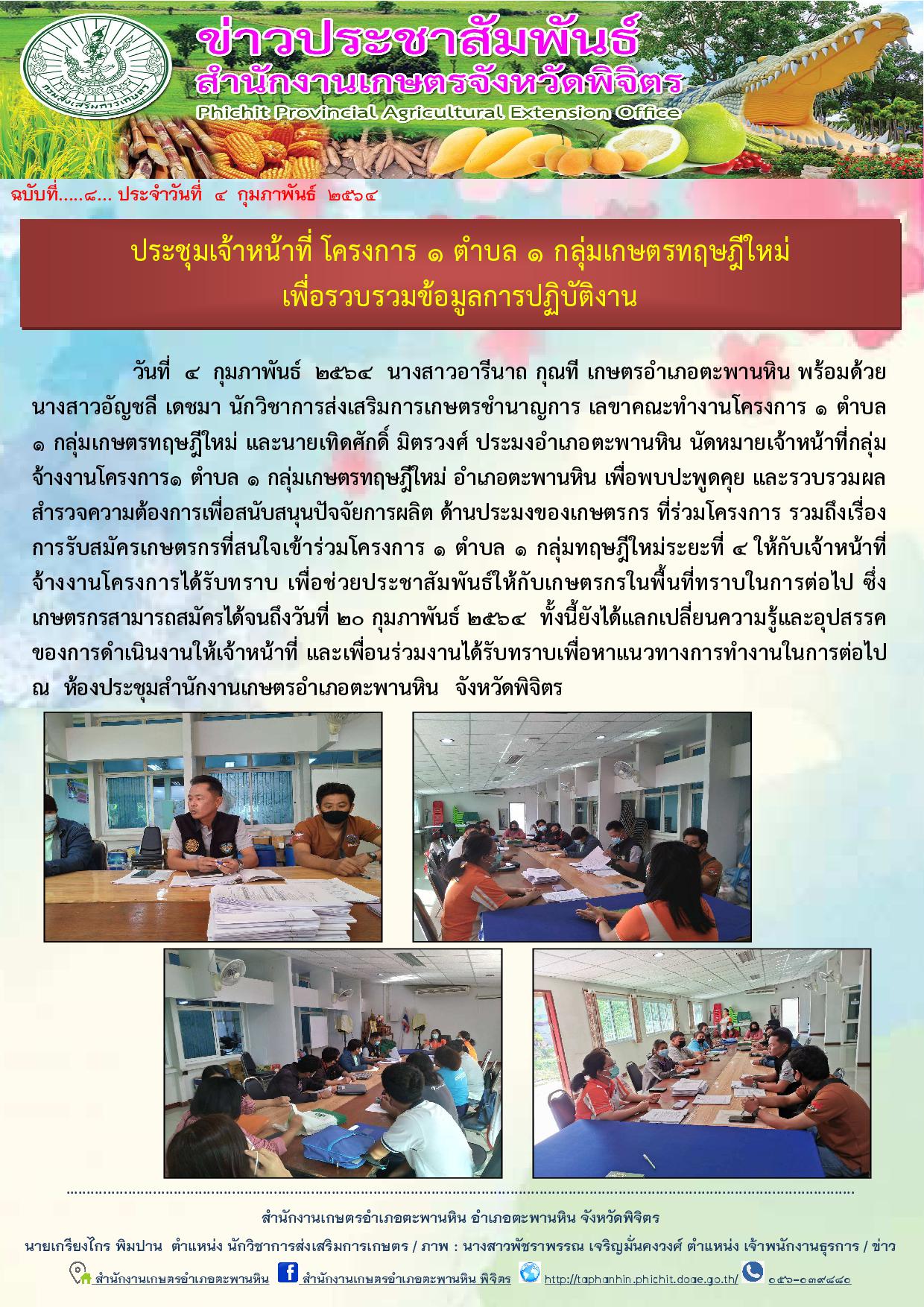 วันที่ 4 กุมภาพันธ์ 2564 นางสาวอารีนาถ กุณที เกษตรอำเภอตะพานหิน พร้อมด้วยนางสาวอัญชลี เดชมา นักวิชาการส่งเสริมการเกษตรชำนาญการ เลขาคณะทำงานโครงการ 1 ตำบล 1 กลุ่มเกษตรทฤษฎีใหม่ และนายเทิดศักดิ์ มิตรวงศ์ ประมงอำเภอตะพานหิน นัดหมายเจ้าหน้าที่กลุ่มจ้างงานโครงการ1 ตำบล 1 กลุ่มเกษตรทฤษฎีใหม่ อำเภอตะพานหิน เพื่อพบปะพูดคุย และรวบรวมผลสำรวจความต้องการเพื่อสนับสนุนปัจจัยการผลิต ด้านประมงของเกษตรกร ที่ร่วมโครงการ รวมถึงเรื่องการรับสมัครเกษตรกรที่สนใจเข้าร่วมโครงการ 1 ตำบล 1 กลุ่มทฤษฎีใหม่ระยะที่ 4 ให้กับเจ้าหน้าที่จ้างงานโครงการได้รับทราบ เพื่อช่วยประชาสัมพันธ์ให้กับเกษตรกรในพื้นที่ทราบในการต่อไป ซึ่งเกษตรกรสามารถสมัครได้จนถึงวันที่ 20 กุมภาพันธ์ 2564 ทั้งนี้ยังได้แลกเปลี่ยนความรู้และอุปสรรคของการดำเนินงานให้เจ้าหน้าที่ และเพื่อนร่วมงานได้รับทราบเพื่อหาแนวทางการทำงานในการต่อไป ณ ห้องประชุมสำนักงานเกษตรอำเภอตะพานหิน จังหวัดพิจิตร