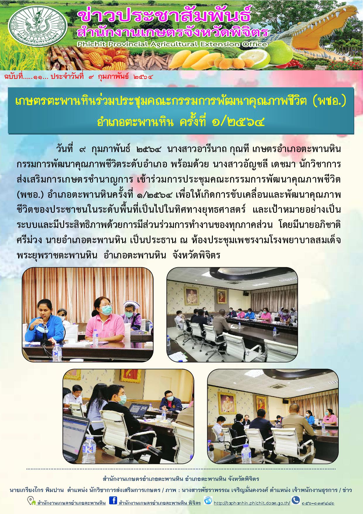 วันที่ 9 กุมภาพันธ์ 2564 นางสาวอารีนาถ กุณที เกษตรอำเภอตะพานหิน กรรมการพัฒนาคุณภาพชีวิตระดับอำเภอ พร้อมด้วย นางสาวอัญชลี เดชมา นักวิชาการส่งเสริมการเกษตรชำนาญการ เข้าร่วมการประชุมคณะกรรมการพัฒนาคุณภาพชีวิต (พชอ.) อำเภอตะพานหินครั้งที่ 1/2564 เพื่อให้เกิดการขับเคลื่อนและพัฒนาคุณภาพชีวิตของประชาชนในระดับพื้นที่เป็นไปในทิศทางยุทธศาสตร์ และเป้าหมายอย่างเป็นระบบและมีประสิทธิภาพด้วยการมีส่วนร่วมการทำงานของทุกภาคส่วน โดยมีนายอภิชาติ ศรีม่วง นายอำเภอตะพานหิน เป็นประธาน ณ ห้องประชุมเพชรงามโรงพยาบาลสมเด็จพระยุพราชตะพานหิน อำเภอตะพานหิน จังหวัดพิจิตร