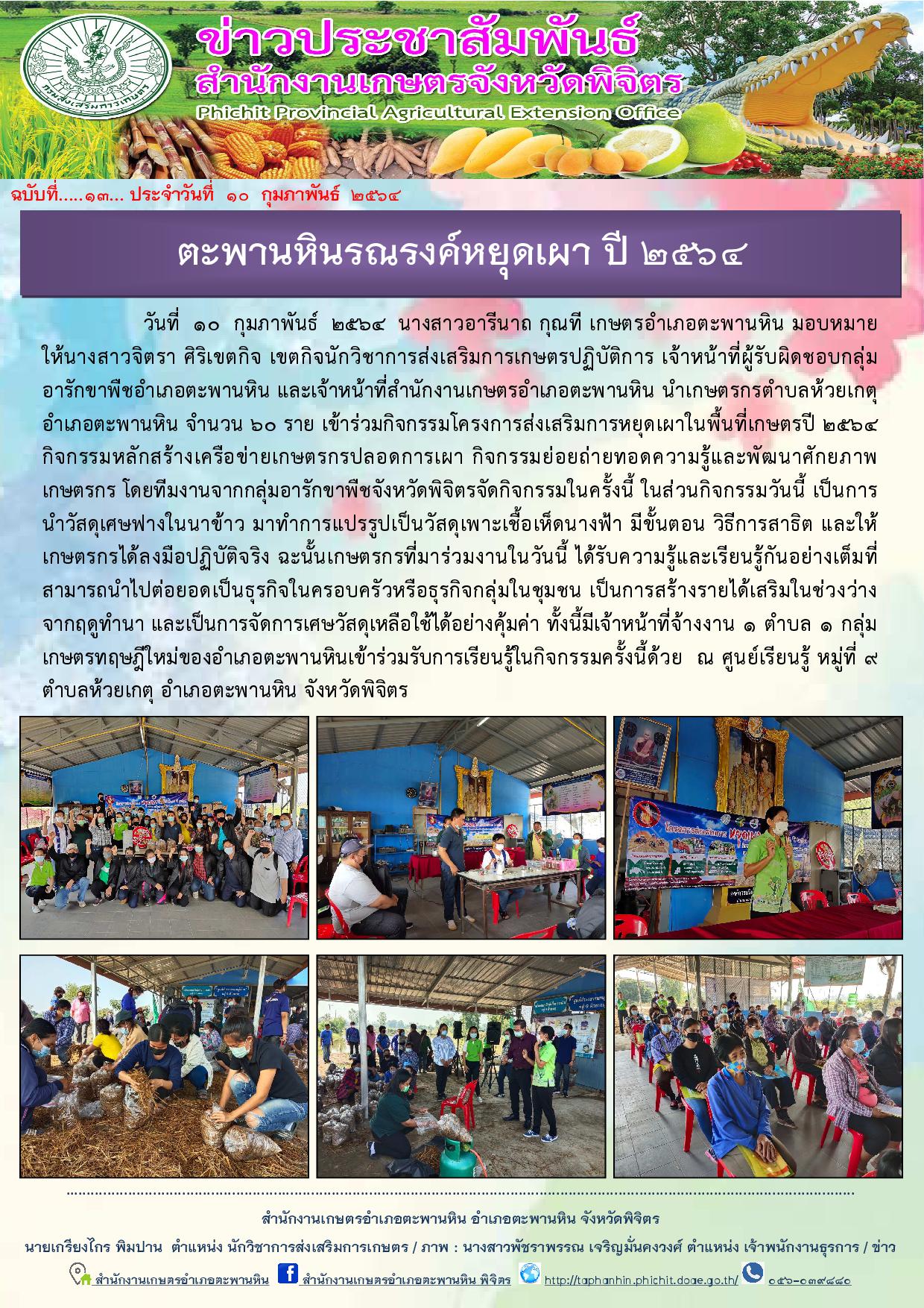 วันที่ 10 กุมภาพันธ์ 2564 นางสาวอารีนาถ กุณที เกษตรอำเภอตะพานหิน มอบหมายให้นางสาวจิตรา ศิริเขตกิจ เขตกิจนักวิชาการส่งเสริมการเกษตรปฏิบัติการ เจ้าหน้าที่ผู้รับผิดชอบกลุ่มอารักขาพืชอำเภอตะพานหิน และเจ้าหน้าที่สำนักงานเกษตรอำเภอตะพานหิน นำเกษตรกรตำบลห้วยเกตุ อำเภอตะพานหิน จำนวน 60 ราย เข้าร่วมกิจกรรมโครงการส่งเสริมการหยุดเผาในพื้นที่เกษตรปี 2564 กิจกรรมหลักสร้างเครือข่ายเกษตรกรปลอดการเผา กิจกรรมย่อยถ่ายทอดความรู้และพัฒนาศักยภาพเกษตรกร โดยทีมงานจากกลุ่มอารักขาพืชจังหวัดพิจิตรจัดกิจกรรมในครั้งนี้ ในส่วนกิจกรรมวันนี้ เป็นการนำวัสดุเศษฟางในนาข้าว มาทำการแปรรูปเป็นวัสดุเพาะเชื้อเห็ดนางฟ้า มีขั้นตอน วิธีการสาธิต และให้เกษตรกรได้ลงมือปฏิบัติจริง ฉะนั้นเกษตรกรที่มาร่วมงานในวันนี้ ได้รับความรู้และเรียนรู้กันอย่างเต็มที่ สามารถนำไปต่อยอดเป็นธุรกิจในครอบครัวหรือธุรกิจกลุ่มในชุมชน เป็นการสร้างรายได้เสริมในช่วงว่างจากฤดูทำนา และเป็นการจัดการเศษวัสดุเหลือใช้ได้อย่างคุ้มค่า ทั้งนี้มีเจ้าหน้าที่จ้างงาน 1 ตำบล 1 กลุ่มเกษตรทฤษฎีใหม่ของอำเภอตะพานหินเข้าร่วมรับการเรียนรู้ในกิจกรรมครั้งนี้ด้วย ณ ศูนย์เรียนรู้ หมู่ที่ 9 ตำบลห้วยเกตุ อำเภอตะพานหิน จังหวัดพิจิตร