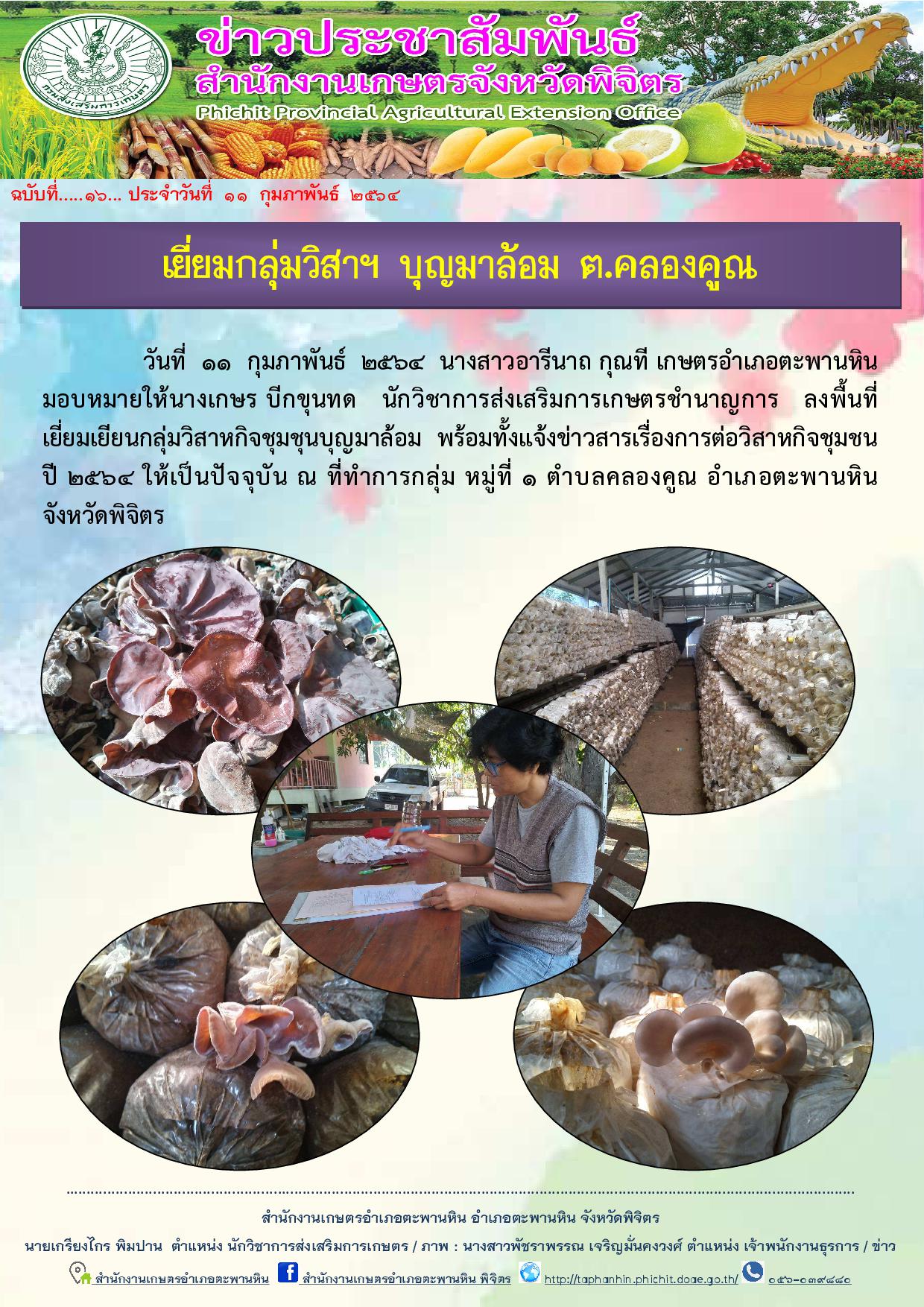 วันที่ 11 กุมภาพันธ์ 2564 นางสาวอารีนาถ กุณที เกษตรอำเภอตะพานหิน มอบหมายให้นางเกษร บีกขุนทด นักวิชาการส่งเสริมการเกษตรชำนาญการ ลงพื้นที่เยี่ยมเยียนกลุ่มวิสาหกิจชุมชุนบุญมาล้อม พร้อมทั้งแจ้งข่าวสารเรื่องการต่อวิสาหกิจชุมชน ปี 2564 ให้เป็นปัจจุบัน ณ ที่ทำการกลุ่ม หมู่ที่ 1 ตำบลคลองคูณ อำเภอตะพานหิน จังหวัดพิจิตร