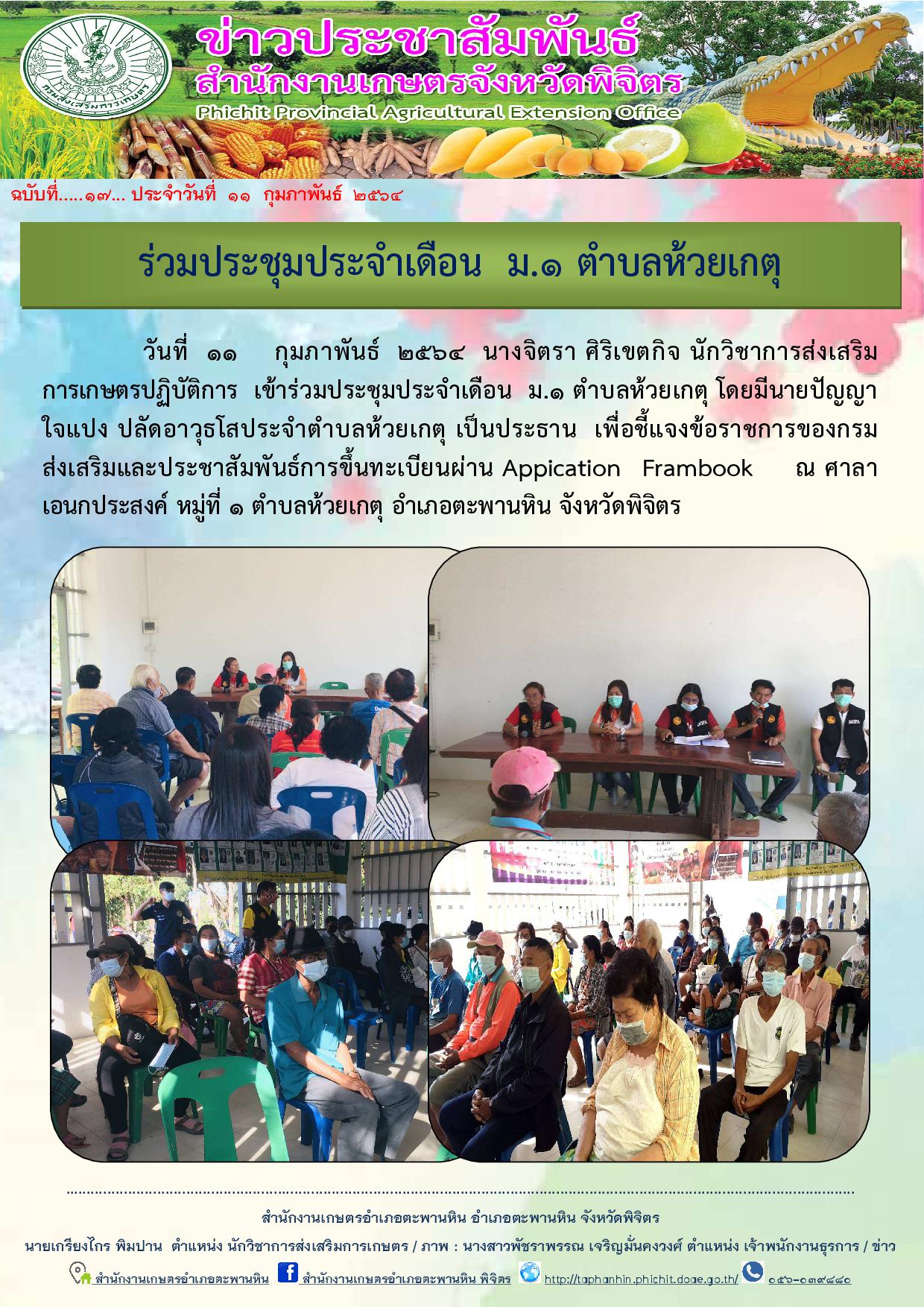 วันที่ 11 กุมภาพันธ์ 2564 นางจิตรา ศิริเขตกิจ นักวิชาการส่งเสริมการเกษตรปฏิบัติการ เข้าร่วมประชุมประจำเดือน ม.1 ตำบลห้วยเกตุ โดยมีนายปัญญา ใจแปง ปลัดอาวุธโสประจำตำบลห้วยเกตุ เป็นประธาน เพื่อชี้แจงข้อราชการของกรมส่งเสริมและประชาสัมพันธ์การขึ้นทะเบียนผ่าน Appication Frambook ณ ศาลาเอนกประสงค์ หมู่ที่ 1 ตำบลห้วยเกตุ อำเภอตะพานหิน จังหวัดพิจิตร