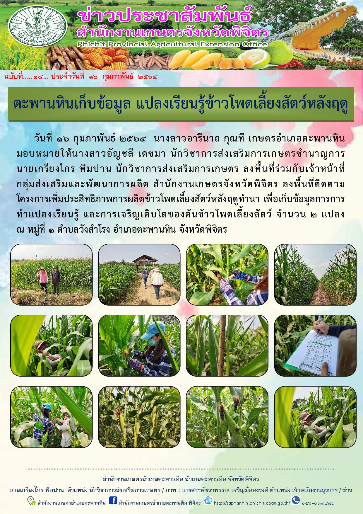 วันที่ 16 กุมภาพันธ์ 2564 นางสาวอารีนาถ กุณที เกษตรอำเภอตะพานหิน มอบหมายให้นางสาวอัญชลี เดชมา นักวิชาการส่งเสริมการเกษตรชำนาญการ นายเกรียงไกร พิมปาน นักวิชาการส่งเสริมการเกษตร ลงพื้นที่ร่วมกับเจ้าหน้าที่ กลุ่มส่งเสริมและพัฒนาการผลิต สำนักงานเกษตรจังหวัดพิจิตร ลงพื้นที่ติดตาม โครงการเพิ่มประสิทธิภาพการผลิตข้าวโพดเลี้ยงสัตว์หลังฤดูทํานา เพื่อเก็บข้อมูลการการ ทำแปลงเรียนรู้ และการเจริญเติบโตของต้นข้าวโพดเลี้ยงสัตว์ จำนวน 2 แปลง ณ หมู่ที่ 1 ตำบลวังสำโรง อำเภอตะพานหิน จังหวัดพิจิตร