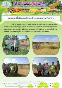 วันที่ 5 ตุลาคม 2564 นางสาวอารีนาถ กุณที เกษตรอำเภอตะพานหิน มอบหมายให้ นางสาวอัญชรี เดชมา นักวิชาการส่งเสริมการเกษตรชำนาญการ ร่วมกับคณะอนุกรรมการตรวจสอบความเสียหายด้านการเกษตรระดับหมู่บ้าน ตรวจสอบพื้นที่ความเสียหายด้านการเกษตร หมู่ที่ 7 ตำบลวังสำโรง อำเภอตะพานหิน จังหวัดพิจิตร